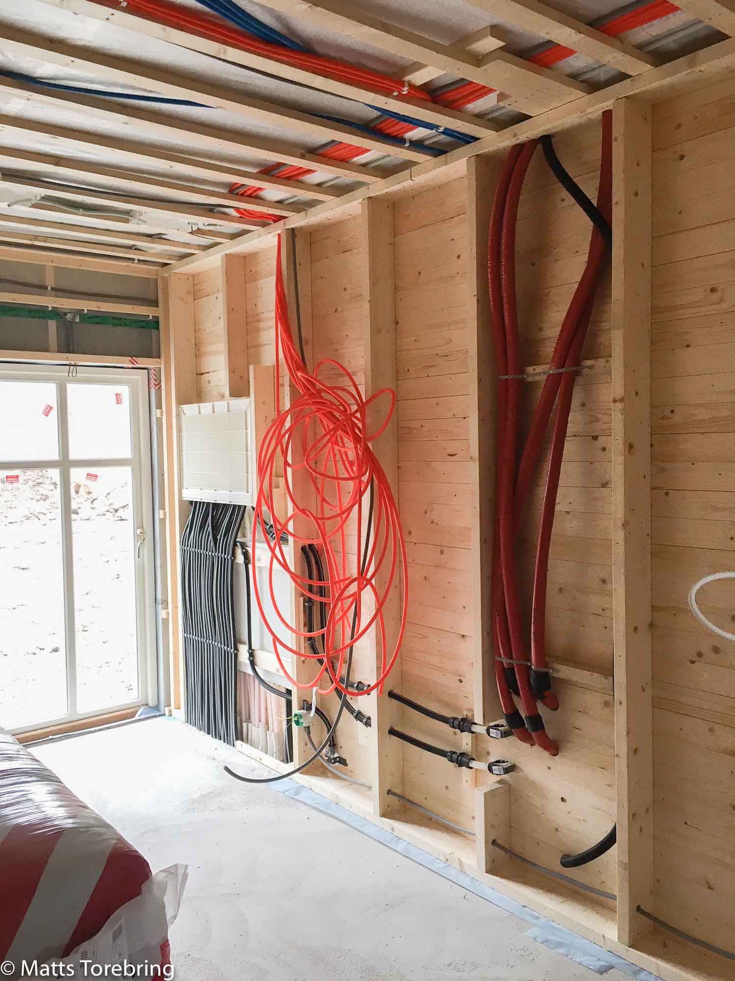 Vi har ordnat ett fint boende, för dotter med familj och andra nattgäster, när de kommer och gästar hemma hos oss. Detta är ett gästrum med dubbelsäng. Här kommer golvvärmen in genom bottenplattan. Om slangarna som kommer upp i golvet, varit en cm fel när bottenplattan göts, hade det varit problem. Det är jag, sa Oskar Palmér på Oskars Rör, som såg till att det blev exakt rätt. Som ni ser finns bara plats kvar för råspont och en gipsskiva.