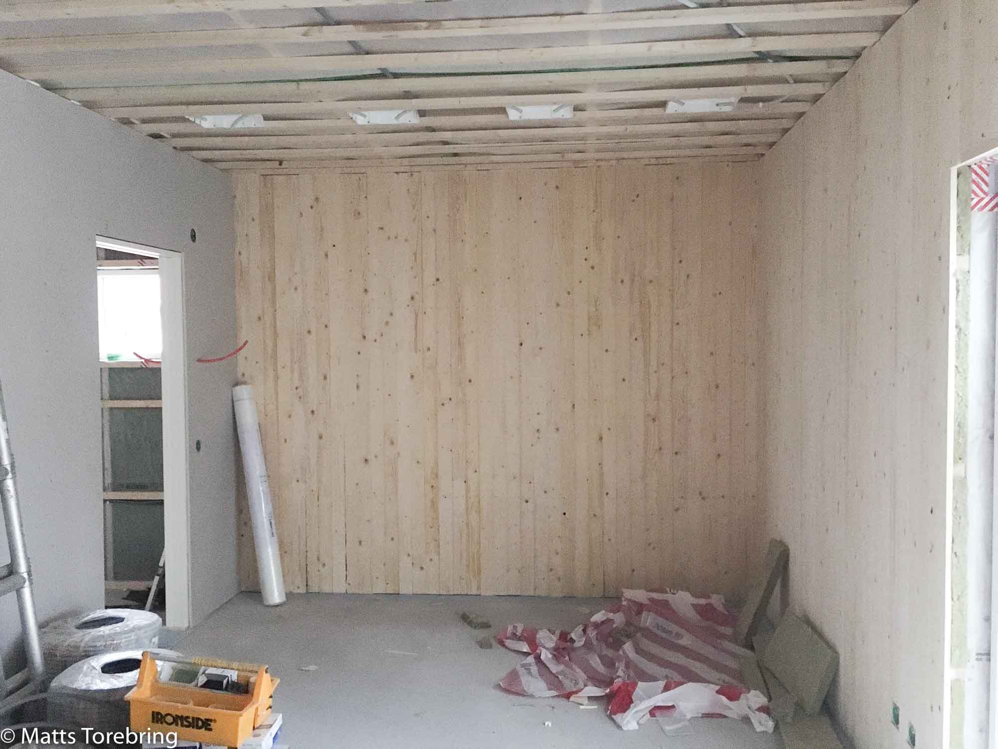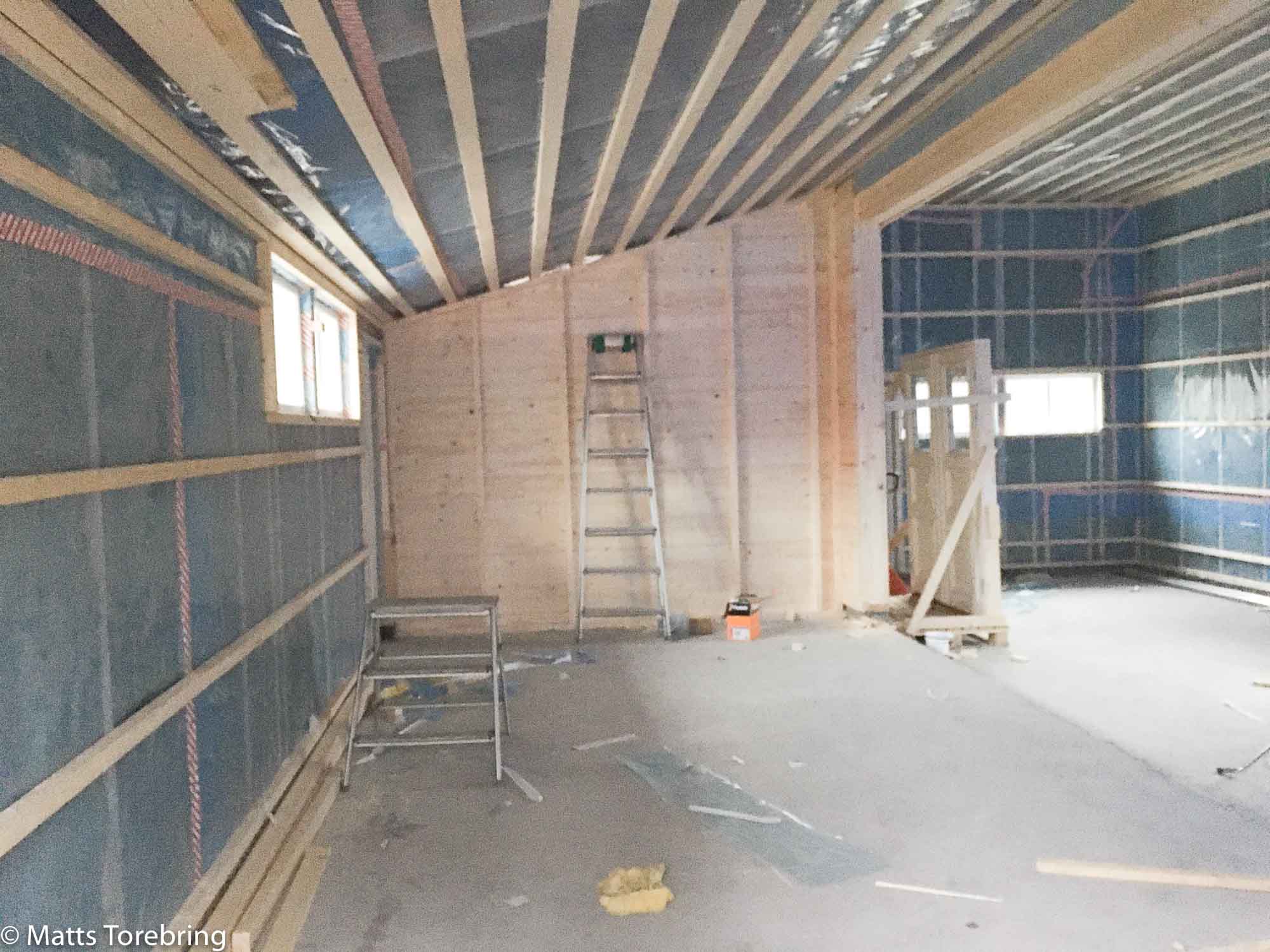 För mig personligen, är det fusk rakt igenom, att bygga med stålreglar och bara gips. Jag varit med om att borra i en sådan vägg och borret började vandra mot stålregeln och hålet blev bara större. ”Det ska vara rejält” sa pappa och så bygger vi. Ovan är det vårt sovrum som börjar att bli klart för spackling. Inne i ladan har vi 17 mm råspont i mellanväggarna och i garagen 22 mm. Dags att städa igen, ser jag.