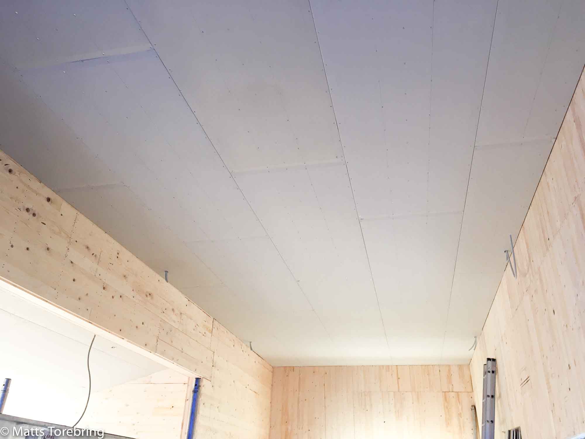 Här gick det fort att gipsa, även om det är högt och besvärligt. Väggarna känns mycket enklare. Belysningen kommer på sidan av bussen, uppe på taket gör den ingen nytta.
