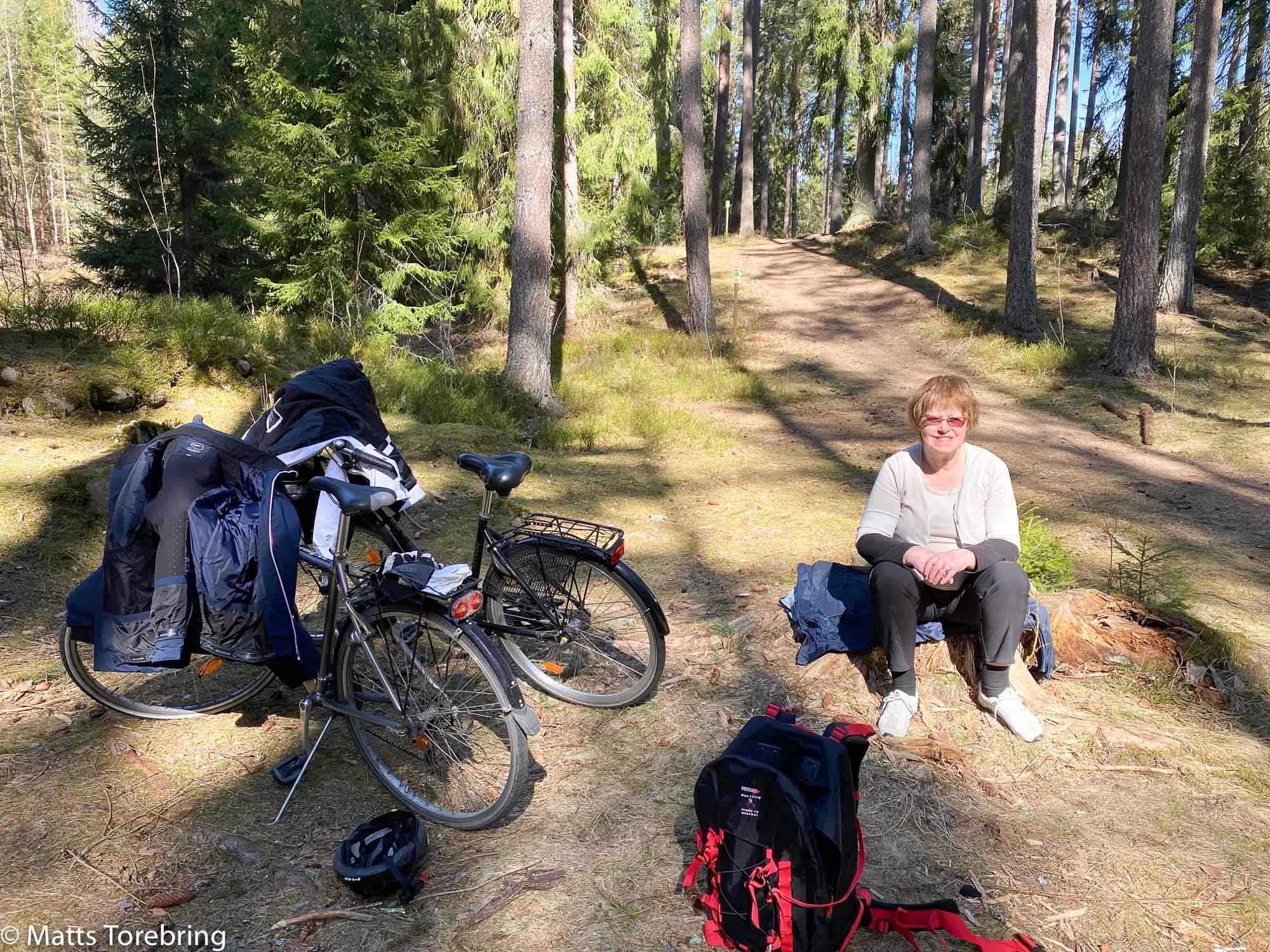 Vi bor kvar på vår ställplats på jobbet, sedan 180 dagar tillbaka. Vi vill vara solidariska med alla andra, som har fått rådet att vara hemma i påsk. Visst kunde vi åkt till en annan sjö och parkerat, men vi vill oftast gå och fika eller gå på restaurang. Det gör vi inte i vår riskgrupp just nu. Vi packade i stället ryggsäcken och trampade iväg i närområdet.