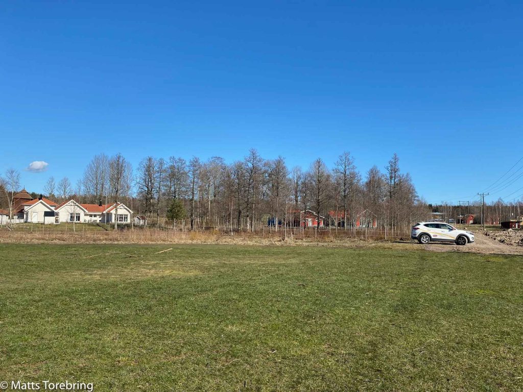Vad kul för barnbarnen att få en bra plats att leka och spela boll på. Vårt röda hus skymtar bakom träden.