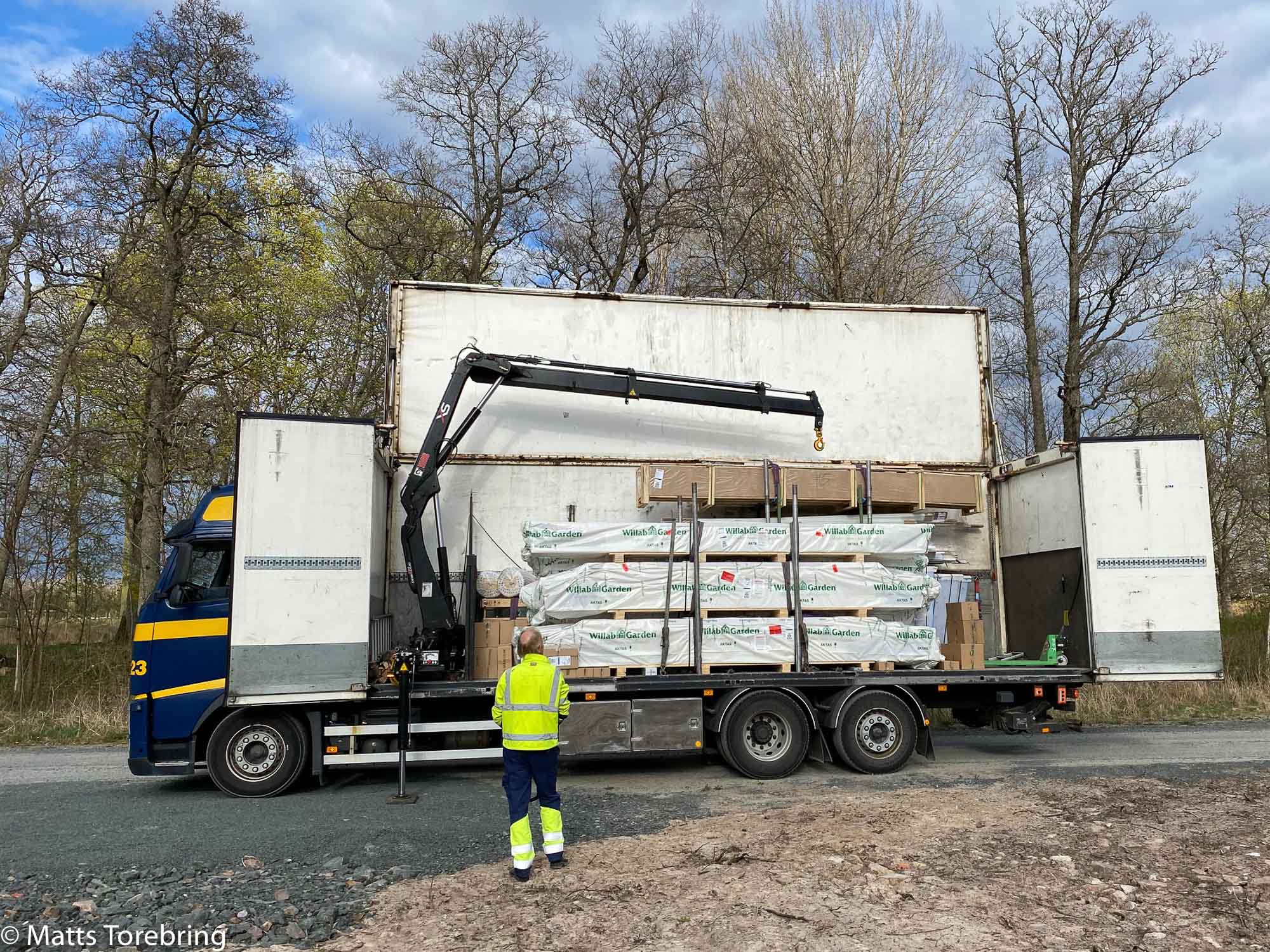 Fram på söndagskvällen fick jag en plingeling, om att min leverans redan var i närheten av oss. Den skulle ha kommit på måndags morgonen. Naturligtvis ville jag hjälpa en åkare, för att lossa sin last. Hela 88 000 mil har denna bil rullat. Ganska fräckt att ha ett hydrauliskt tak, att öppna upp också.
