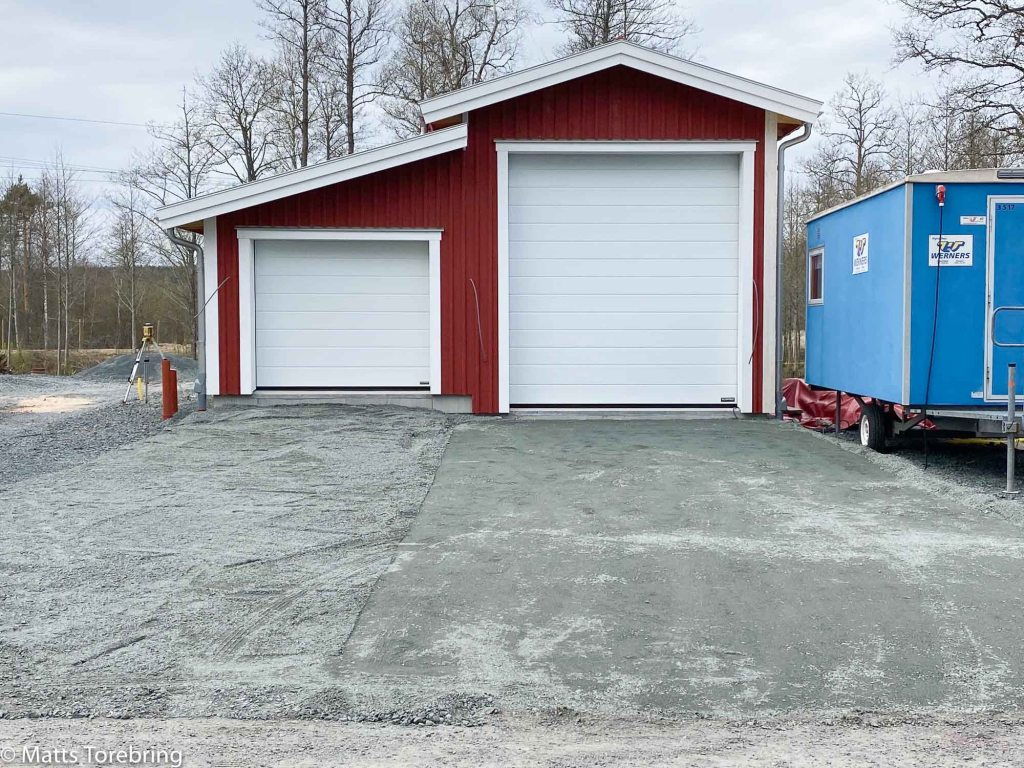 Herdens garageinfart är klar. Här blir det 12 cm betong. Allt det övriga 10 cm. Detta blir obetydligt dyrare än att lägga betongplattor och går mycket snabbare. Sedan slipper Matts ligga och skrapa bort mossa i plattskarvarna.