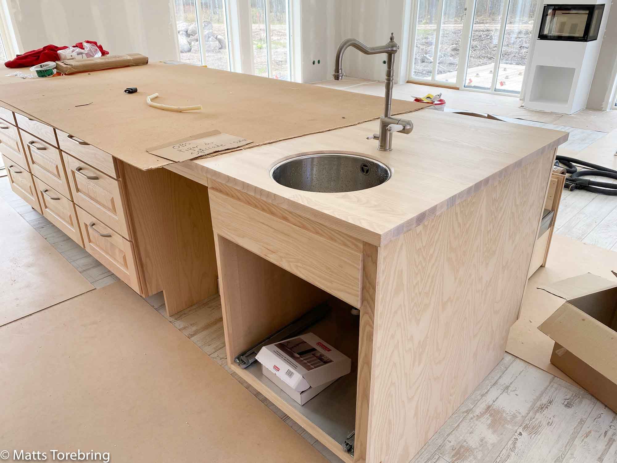 Vår köksö, 3,3 x 1.02 med diskmaskin och diskho. Nu kan jag köra tillbaka boden ute på gården, nu finns det wc och vatten i två badrum inne.