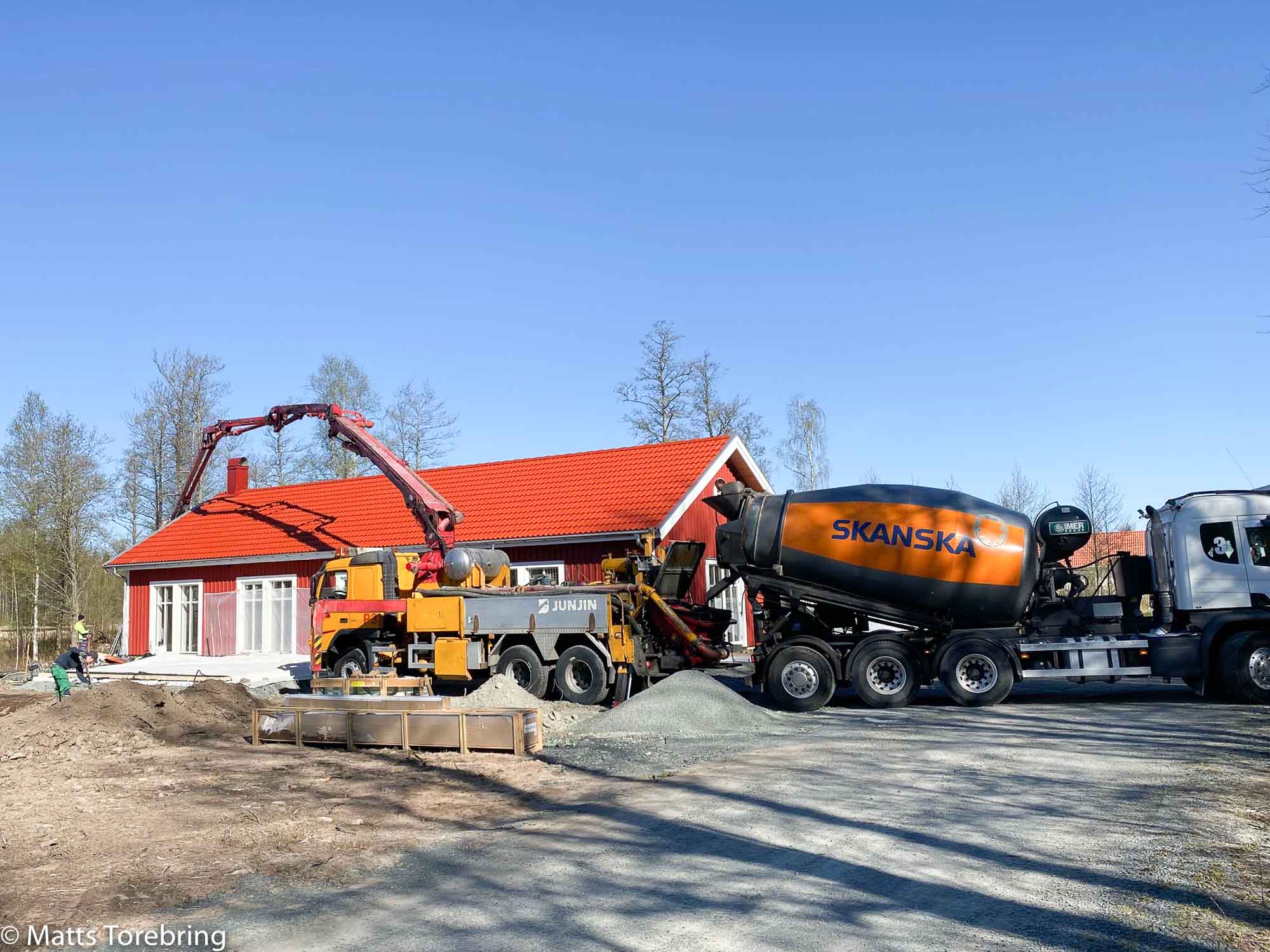 Full fart med betongbil och en pumpbil, i dag på morgonen vid halv åtta tiden.