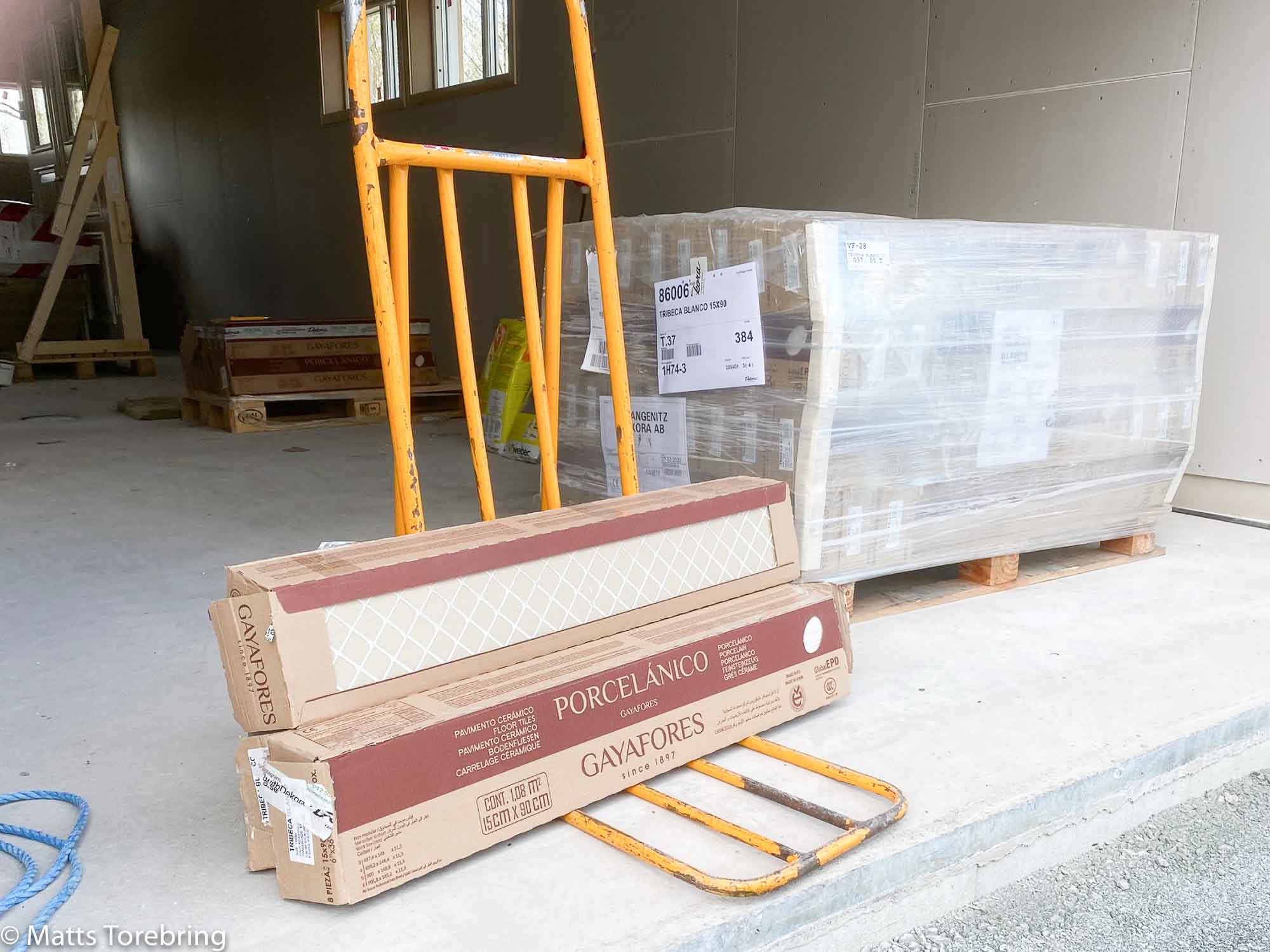 Jag lastade upp tre paket åt gången på kärran (75 kg). Tre hela pallar med klinkers i garaget bar jag sedan in och placerade ut i rummen. Totalt 3200 kg på fem timmar. Sedan var jag nästan svimfärdig.