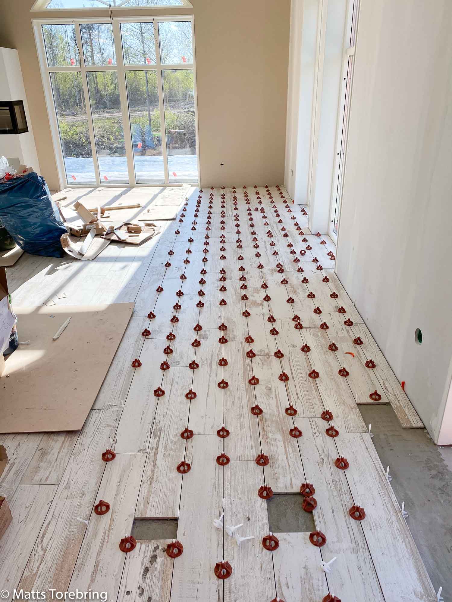 Detta att lägga klinkers är ett mästarverk. Om en klinker skulle komma 1 mm fel, då blir hela golvet fel. Det märks att Patrik kan sin sak och har hunnit betydligt mera idag, tack vare att alla kartonger med klinker var inburna av mig. (Det extremt tunga jobbet gör jag inte om) Nu är golven i vardagsrum, kök, tvättstuga och två badrum klara. Det är en bra bit på väg. Återstår entré, hall och tre sovrum samt en klädkammare. Nu börjar det kännas, att golv och väggtapet harmoniserar.