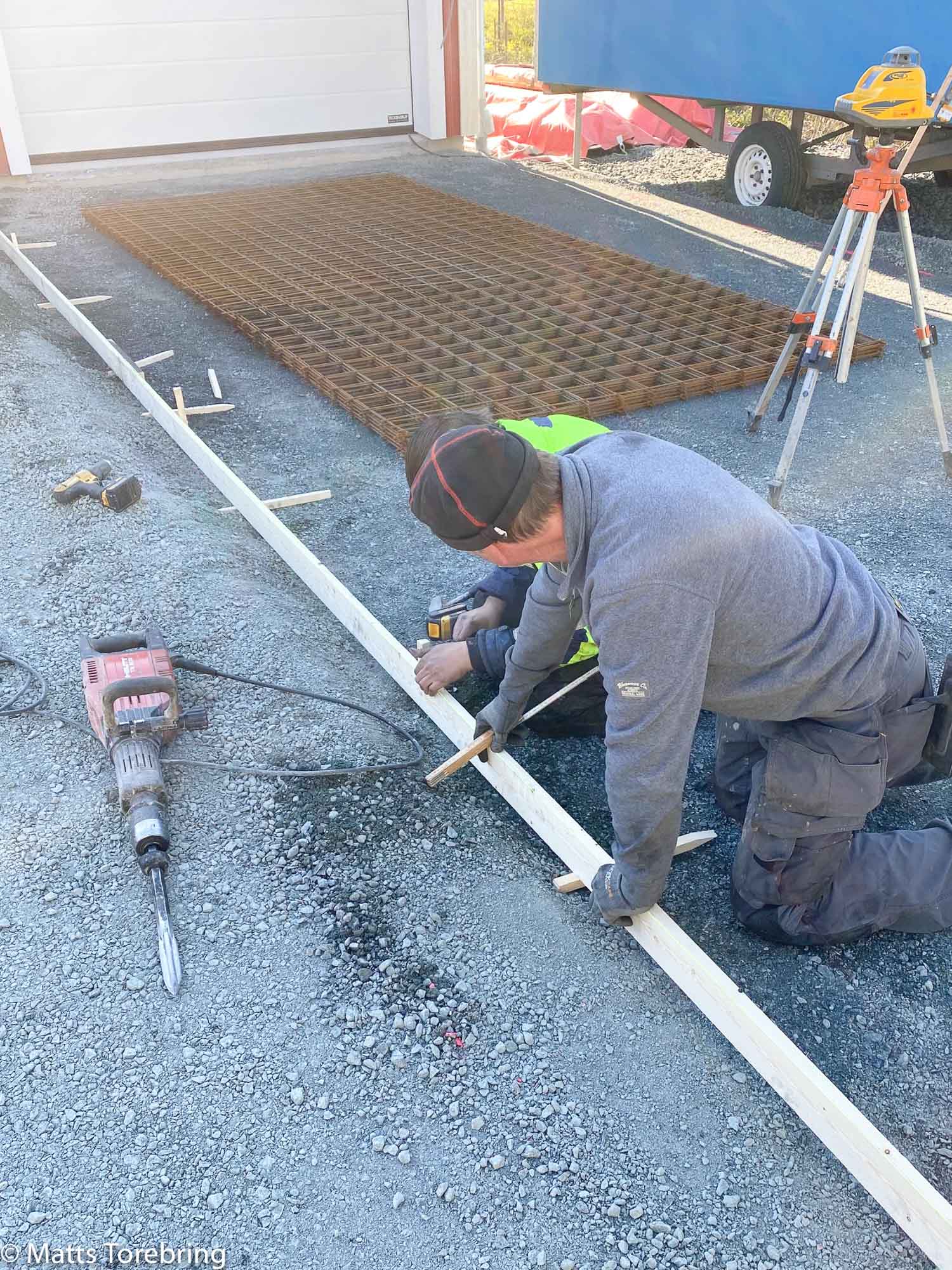 Först hade jag tänkt att ha en entré, även till och från postlådan. Den tog jag bort och valde istället att göra uppfarten till lillbilen en meter bredare. Då blir det en fin sammanhängande entré i stället. Klockan är sex på kvällen, men grabbarna kämpar vidare.