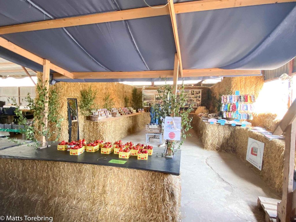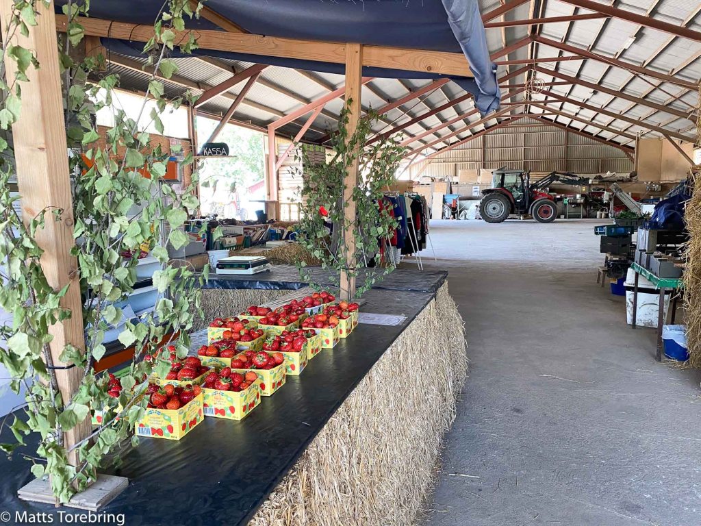 Visst ser det lite hejigt ut, jordgubbar och traktorer. Här fanns massor av olika inläggningar sylt, marmelad, saft, glass, matolja, vinäger och hudvårdsprodukter. Mycket potatis och ägg och inte minst de söta Ölands jordgubbarna. Ute i maskinhallen fanns även ett loppis, fast det är inget vi besöker, vi avyttrar i stället.