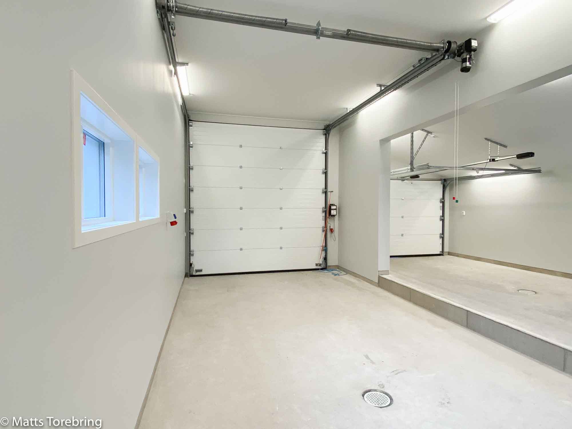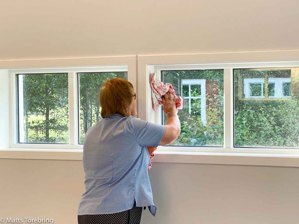 Birgitta putsade fönstren. Själv tog jag fram vattenslangen och spolade av golvet för första gången. Sedan möblerade jag lillbilens rum, med våra cyklar, min arbetsbänk och den stora snöslungan. Det var ändå mycket rymligt.