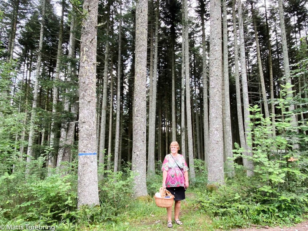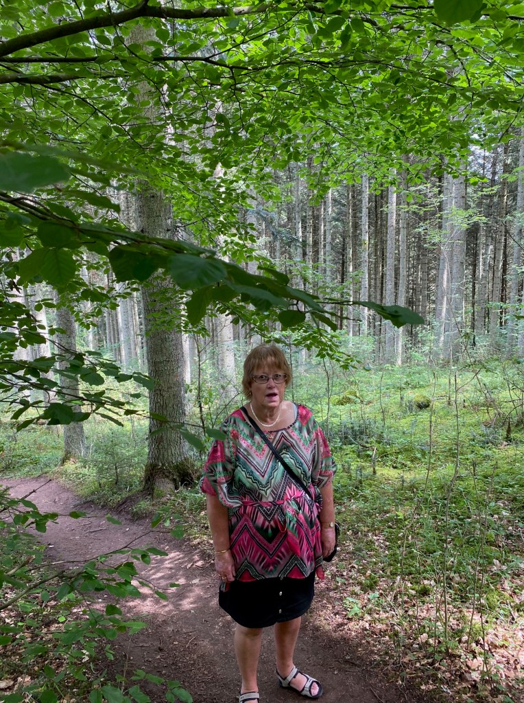 Vid parkeringen till utsiktsplatsen möter oss denna vackra skog. Det går inte att återge dessa enorma träd i bild. De är så stora, de är mega långa och grova.