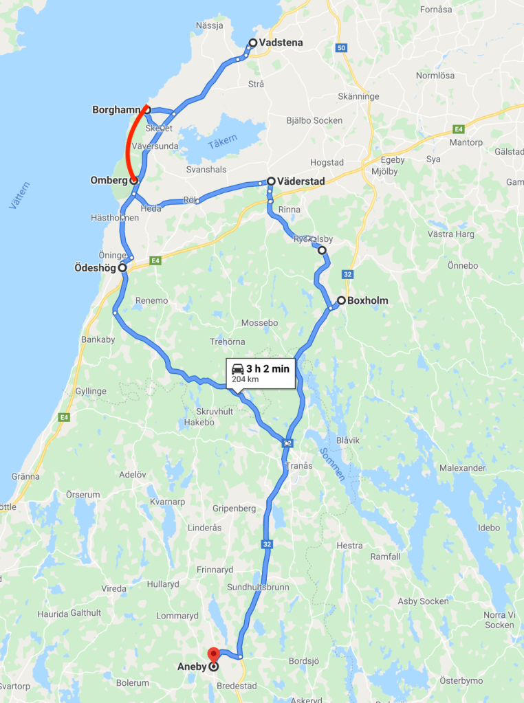 Först körde vi en väg, som vi inte har minne på att vi kört tidigare, en ”rätt-övers-väg” från Boxholm till Väderstad. I Väderstad tog vi en ny ”rätt-övers-väg” till Omberg. Från toppen av Omberg körde vi den smala kustvägen från Omberg till Borghamn. Den vägen finns inte med på Google maps. (röda linjen) Ingen av dessa vägar är att rekommendera med en större husbil.