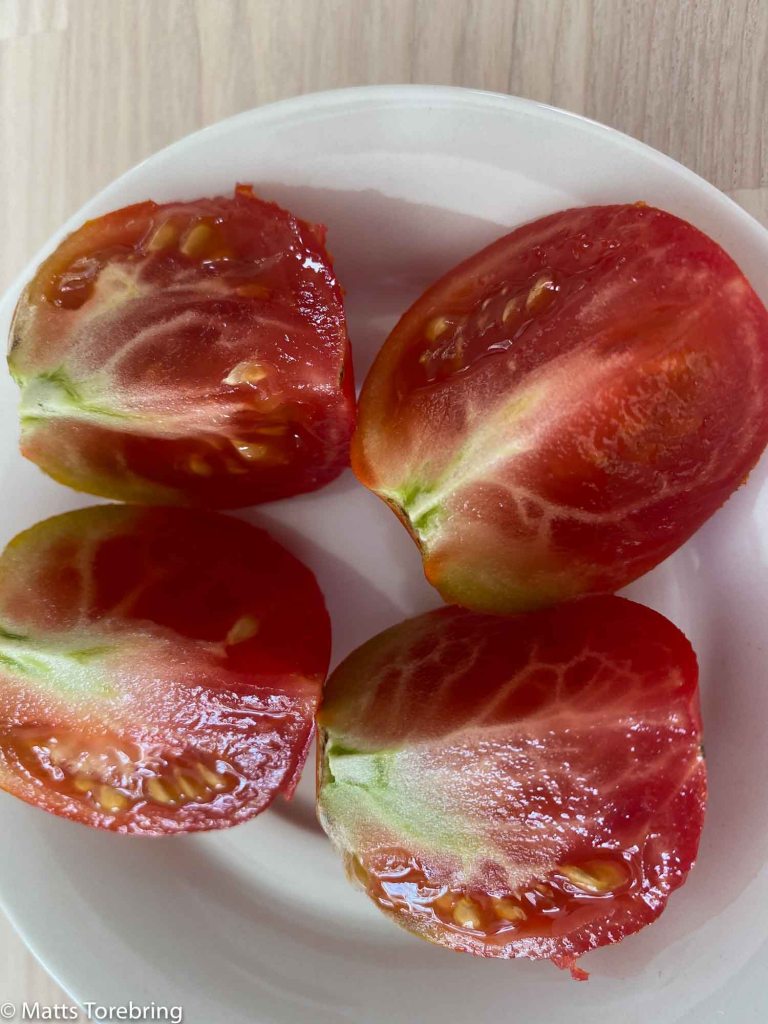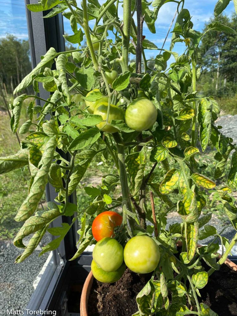 Idag plockade vi av den första tomaten, från den då ynkliga lilla planta som vi köpte på en gårdskärra på södra Öland, för sex veckor sedan.
