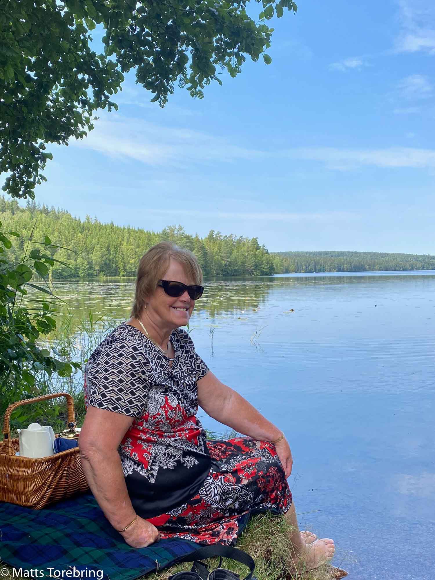Vi packade en kaffekorg och tänkte fika vid badplatsen Liden, (Östergötland) vid norra stranden av sjön Västra Lägern. Men oj va fullt med folk det var. Vi körde vidare till södra spetsen av sjön, där vi hittade en liten grön yta att sitta på.