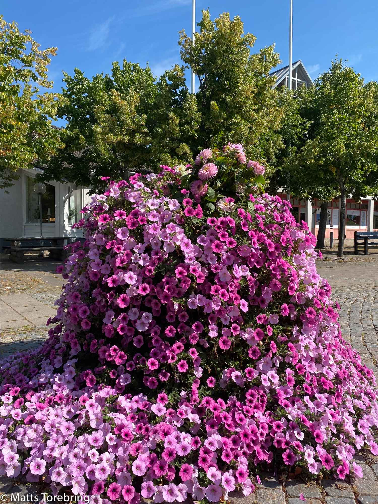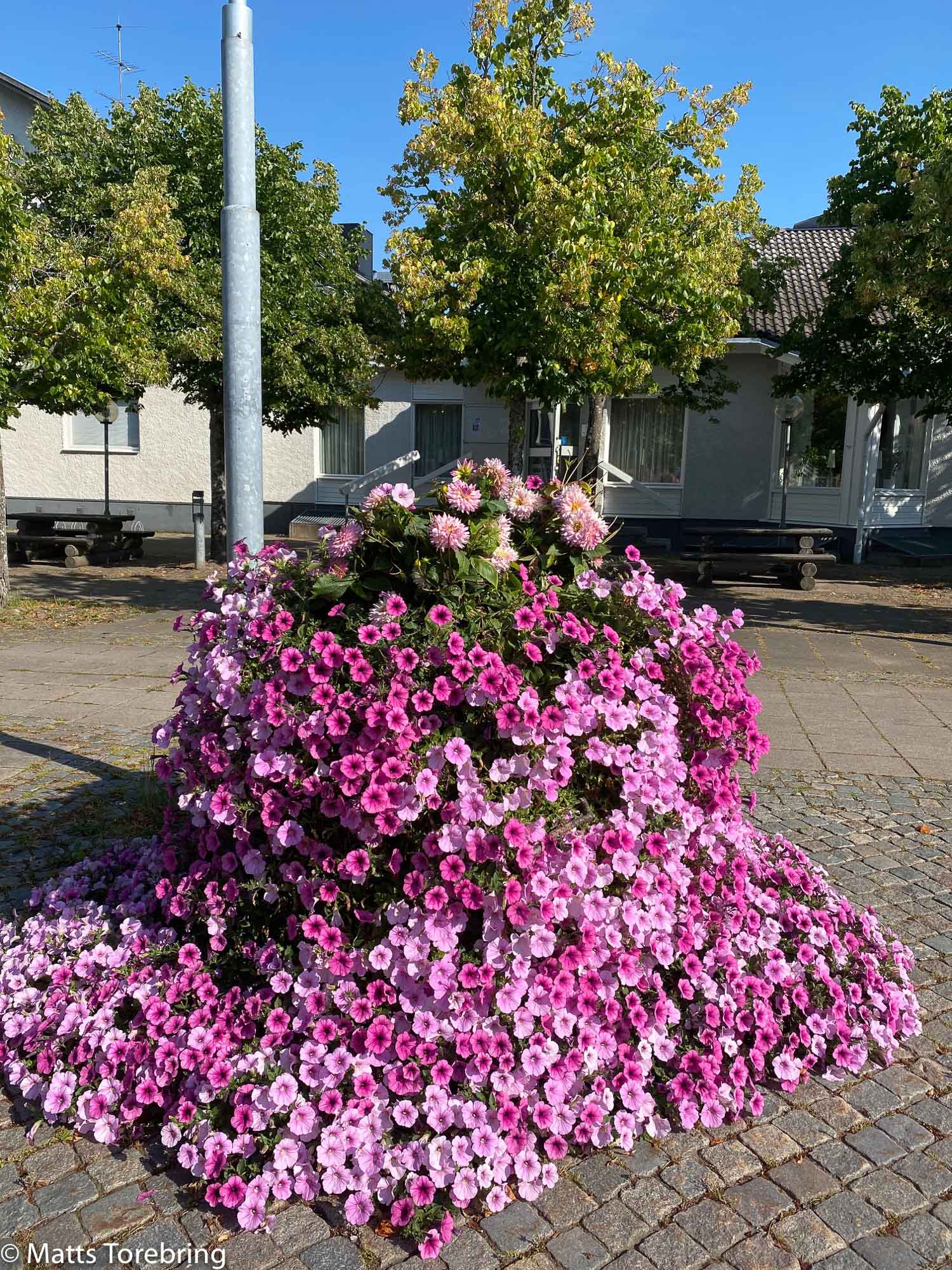 Som lite tröst trots allt, möttes vi av dessa fantastiskt vackra blomsterarrangemang på Fredstorget. Detta måste vi ge en eloge för. Någon förändring av Storgatan kommer nog inte i närtid, då det är Vägverket som säger sitt om detta. Kanske dags att starta ett enfrågeparti till bästa val. TBG Partiet, ta bort guppen!