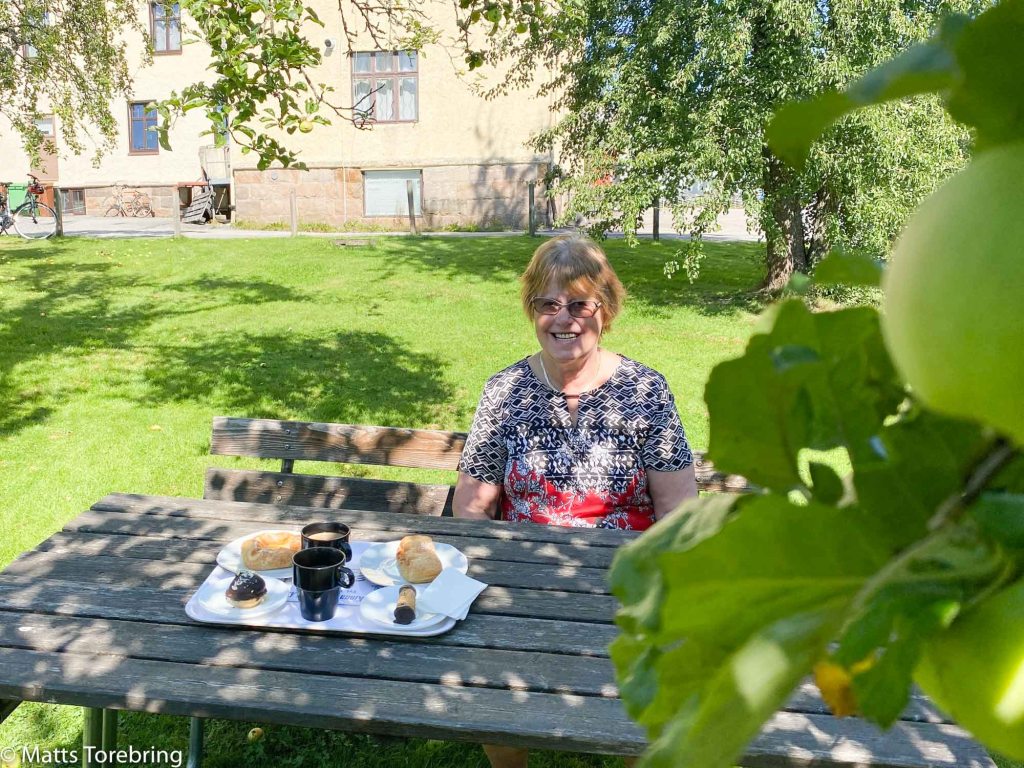 Det sägs om familjen Torebring, ”Har de inget att göra, fikar de”. Ett gammalt hus, ett fint hantverk i bageriet och utsökta bakverk i diskarna. Vi gick runt huset och satte oss under de stora äppelträden. Hon måste räknat fel, 120:- för detta vrålfikat. Strax intill satt en trevlig Göteorgsfamilj som spontant började prata. Vi samtalade om det mesta, i mer än en halvtimma. Trevligt!