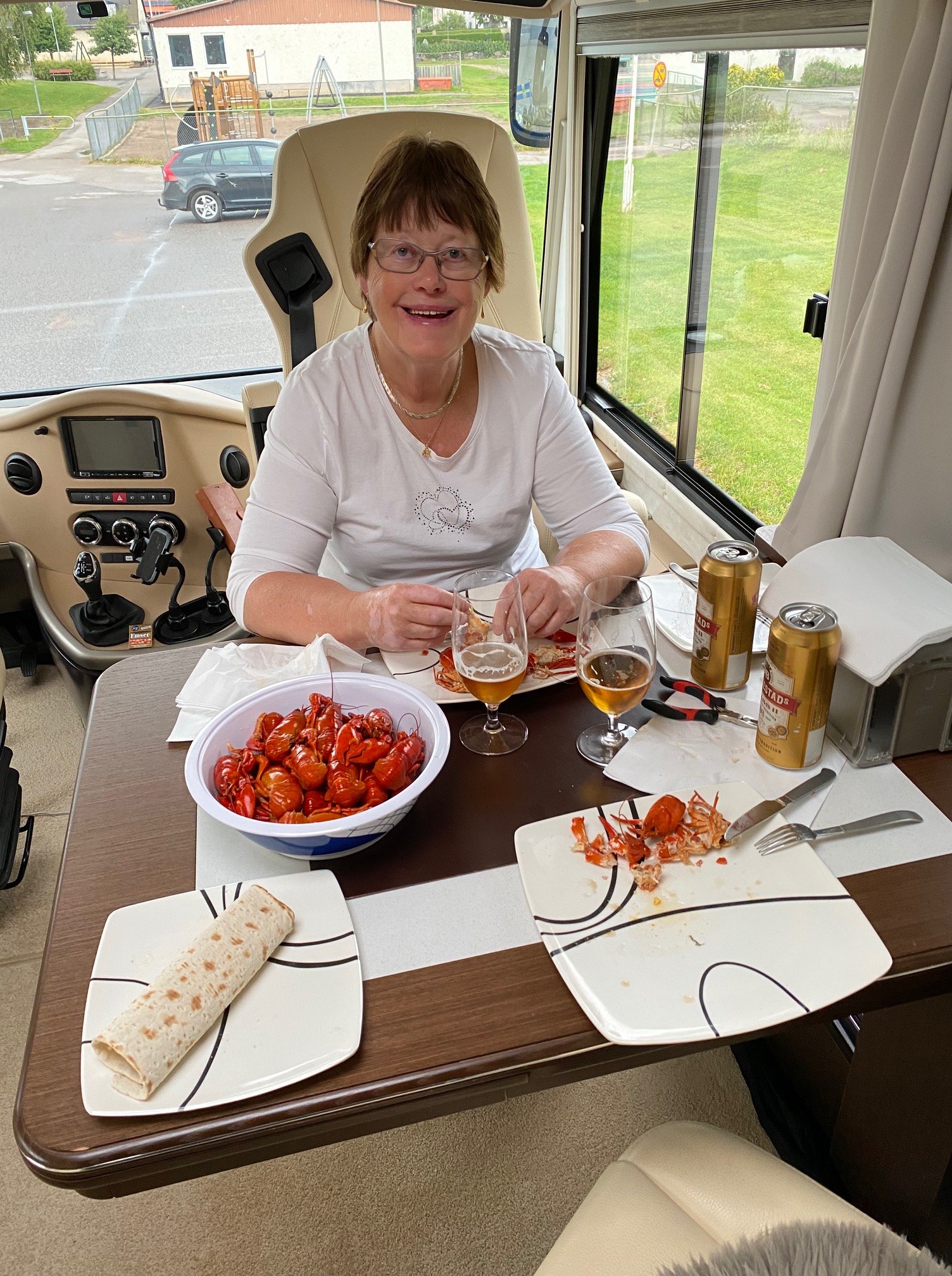 Vi brukar alltid vilja äta kräftorna utanför bussen, men +14 grader är inte njutbart.