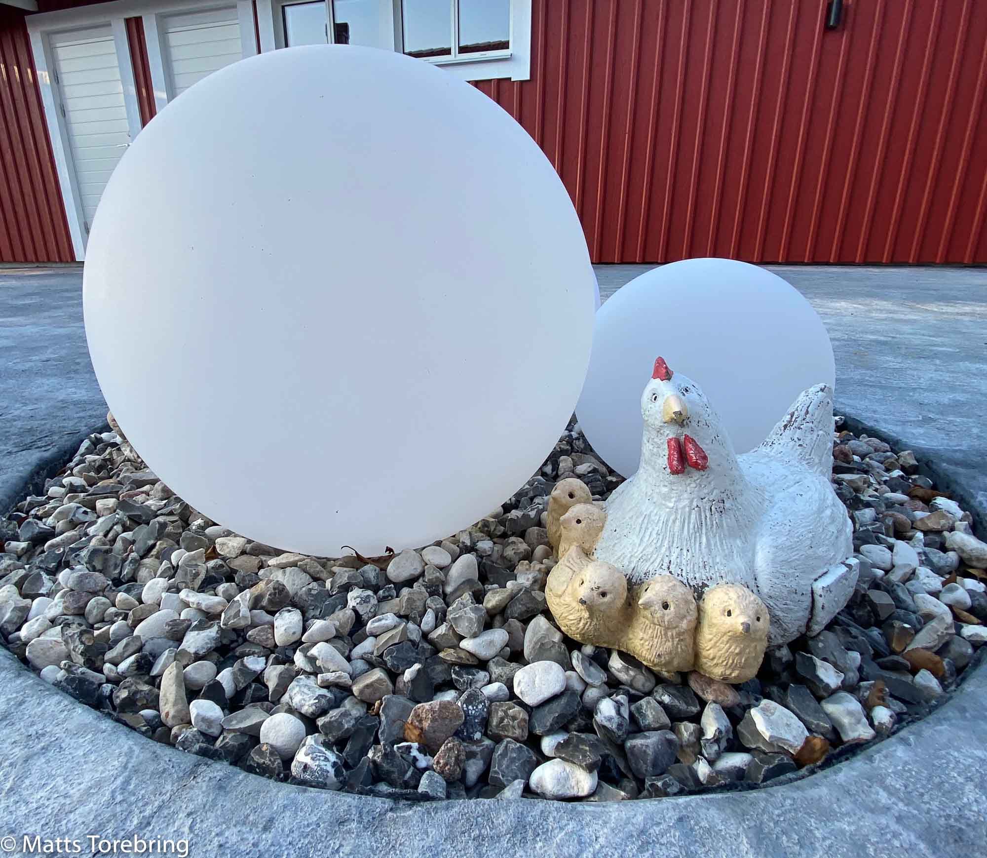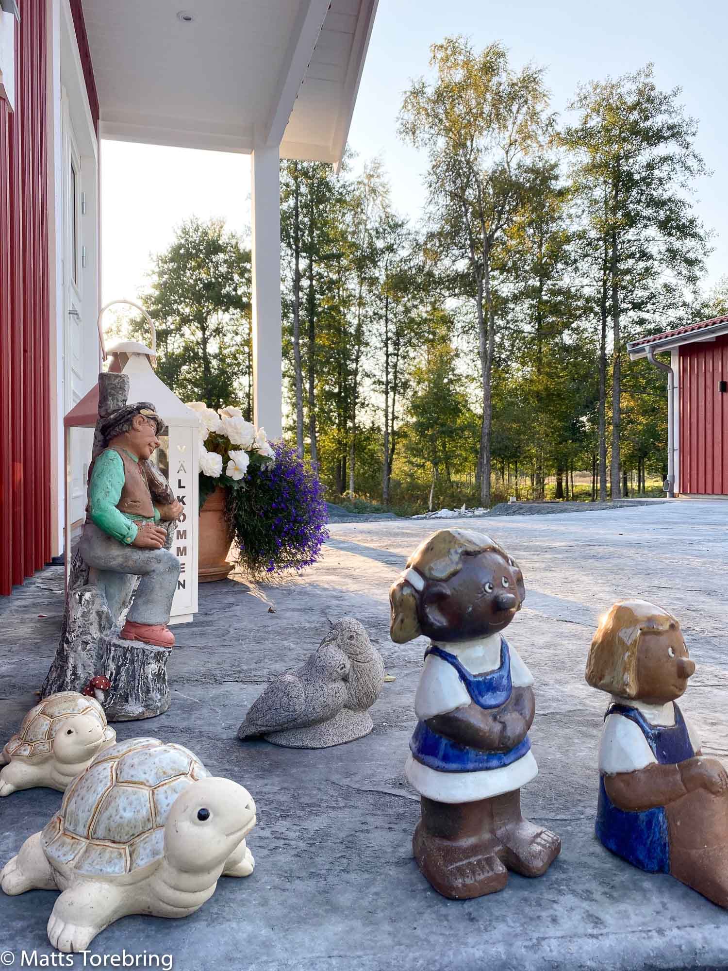 När jag fyllde 60, önskade jag mig djur, för att kunna placera ut i trädgården som prydnad. Några få är kvar sedan dess. Andra har avlivats i flytten. Hönan med kycklingarna behöver sminkas upp med lite vit färg bara.