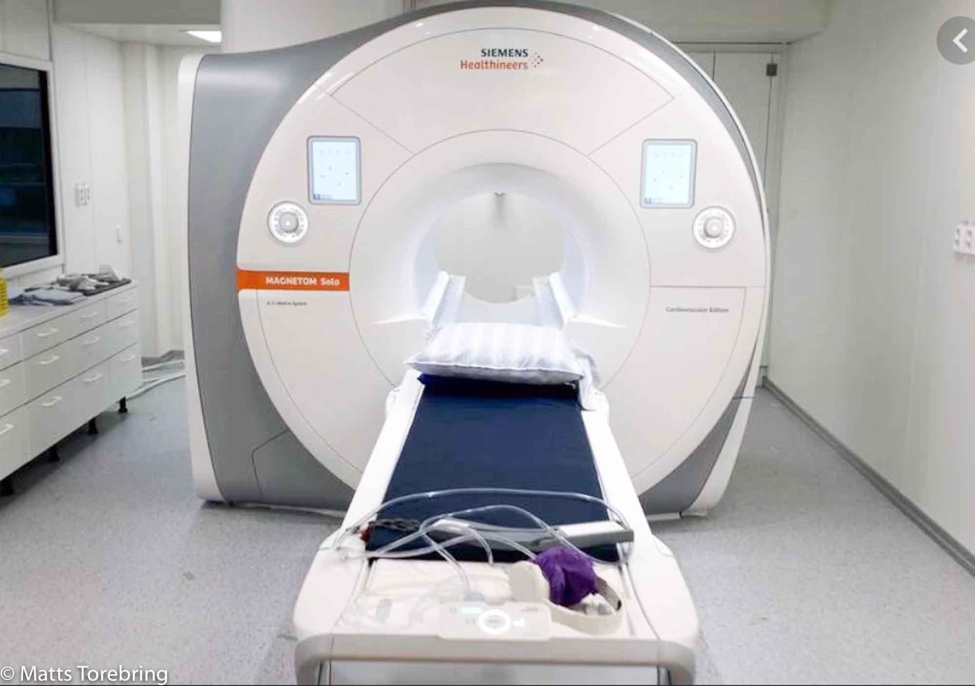 Här fick jag ligga på britsen, som sedan rullades in i tunneln. Jag fick hörselproppar och hörlurar på mig. Jag fick inte röra mig någonting. Tydligen låg jag helt still, för allt var över på dryga 20 minuter. Innan hade det sagts mig att det tar 35 minuter.