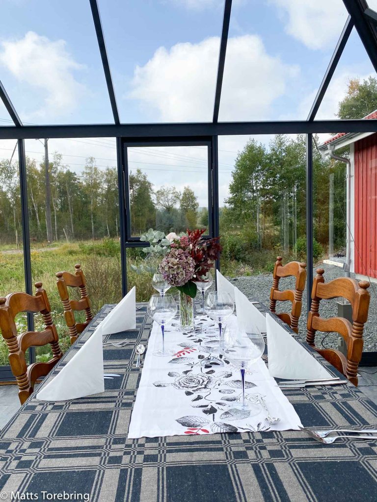 Duka bordet faller alltid på min lott och jag tycker om att göra det. Först satte jag på en värmefläkt, men sedan kom solen och det blev för varmt att sitta utan ett parasoll.