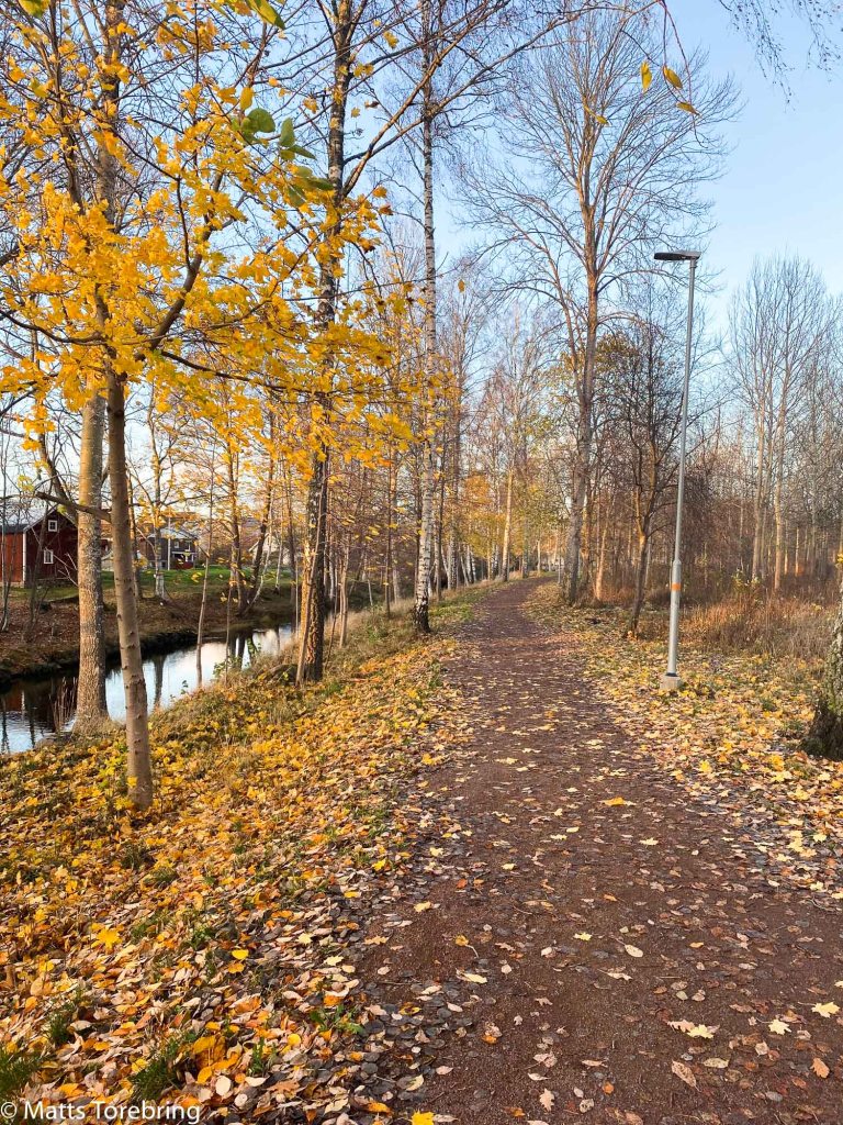 Visst blir man på gott humör, när man går hem från jobbet och solen skiner. November behöver inte vara grå. Jag skulle verkligen sakna, om jag inte fick uppleva de fyra årstiderna hemma i Sverige. Det är nästan spännande att se, hur vädret blir varje dag. Men vilken fin väg jag har till jobbet! Birgitta ogillar att gå, så hon åker bil både bort och hem. På morgonen åker vi båda bil.
