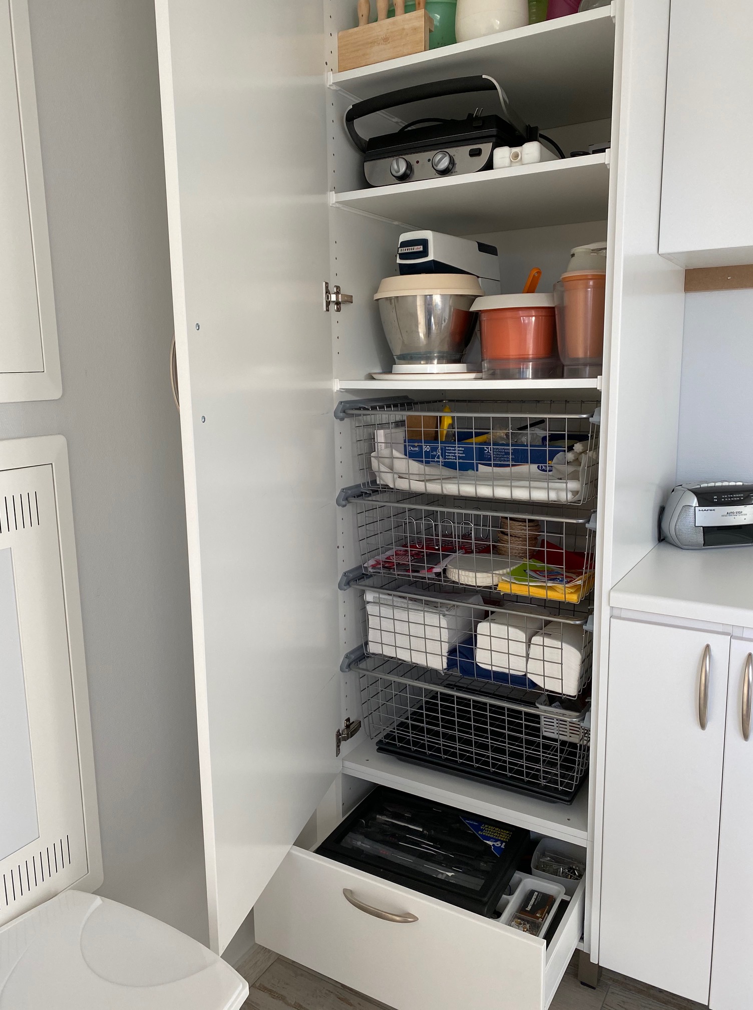 Vill att var sak har sin plats och veta att det ligger i tredje lådan osv . Ser att eran assistent och tryckkokare inte används så ofta som våra hahaha Det är två viktiga apparater, som vi använder jämnt, därför står assistenten framme och inte behöver lyftas upp och ner, fram och tillbaka. Hade gärna sett att vi kunde ha skärmaskinen framme också men det gick inte.