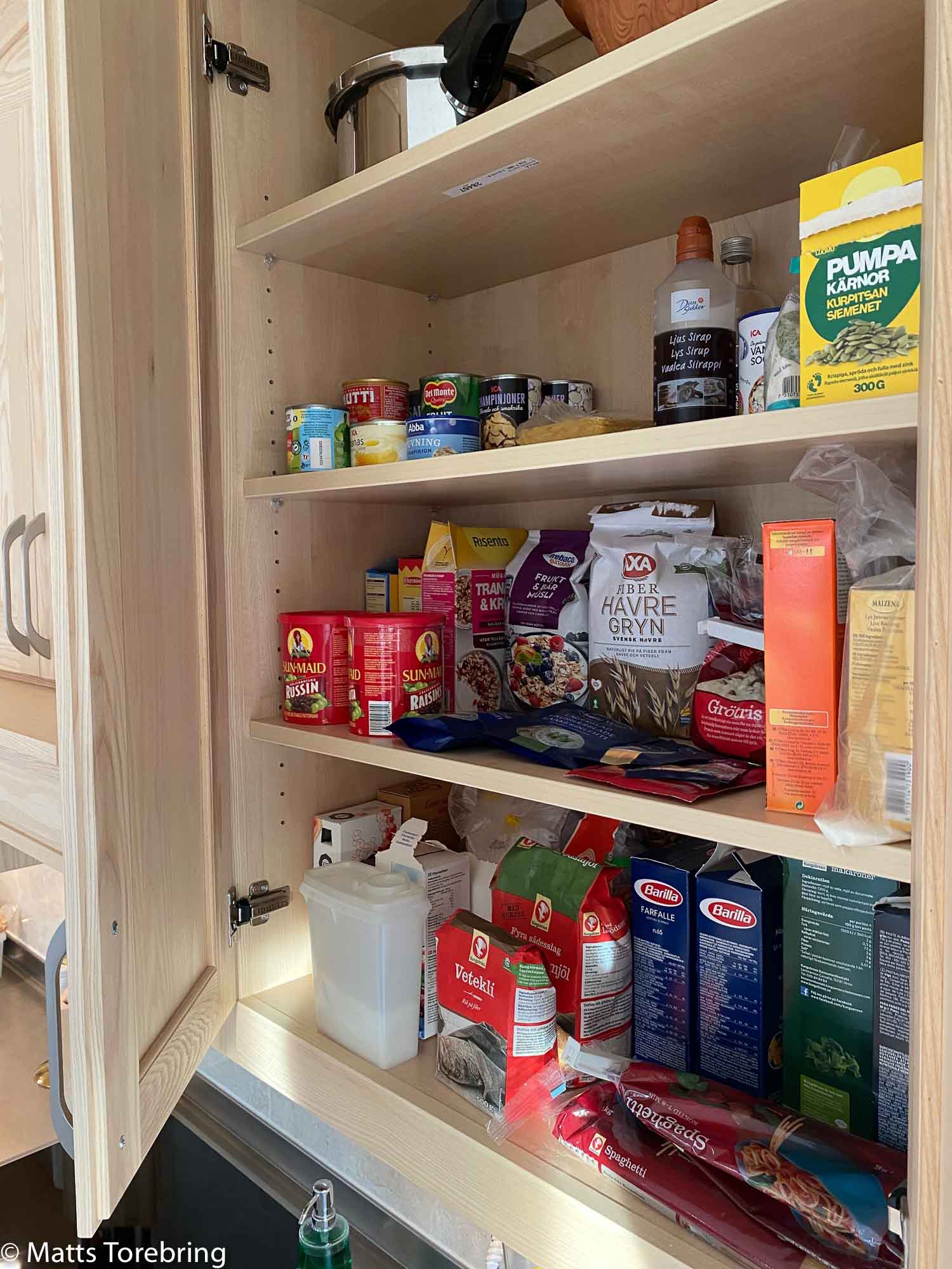 Med tanke på att vi har ganska höga skåp, placerades dagligvaror längst ned och sällan produkter högst upp.