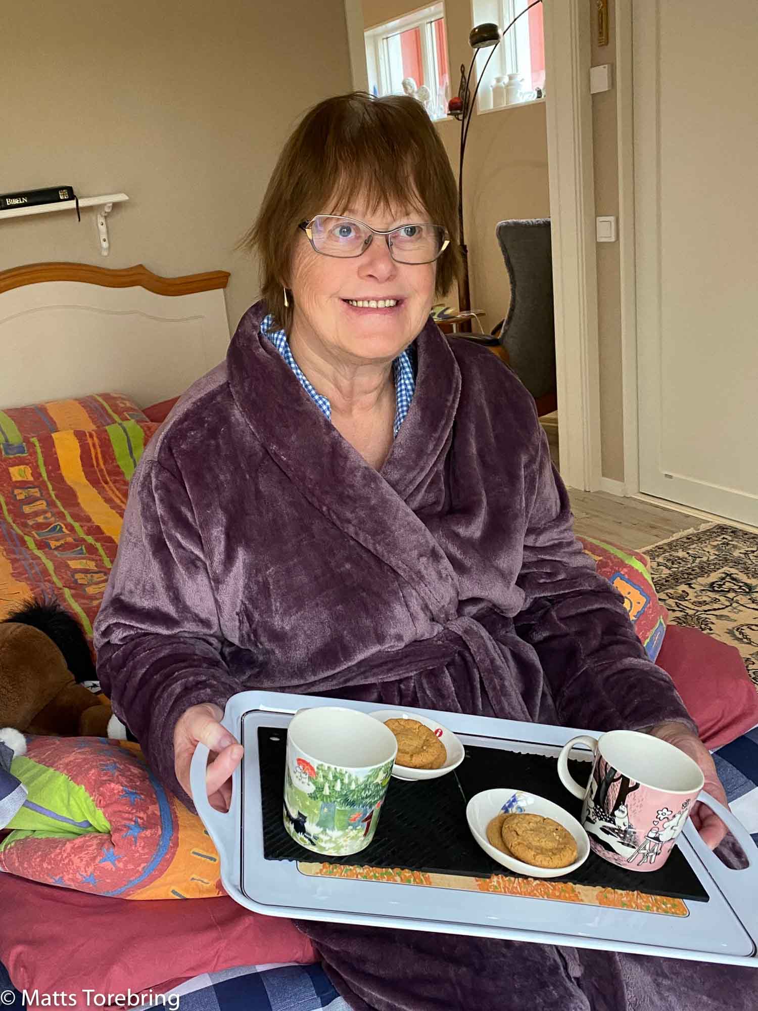 Birgitta tackar sällan nej till kaffe på sängen, så inte i dag heller. Ett tips till er alla ”kaffe på sängen älskare”. Välj en stabil kaffebricka till exempel från Villeroy & Boch, lägg ett par silikon underlägg på brickan och det går att luta brickan ganska mycket, utan att något far av, eller spiller ut, allt står kvar på sin plats.