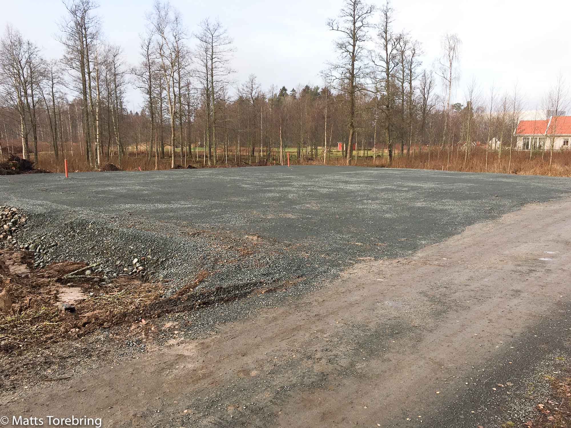 För ett år sedan gick vi och väntade på svaret. Kan vi bygga utan att påla, detta efter att vi fyllt upp tomten med 2 700 ton 0 – 150 sten. Mätningarna visade en förändring med en mm under tre veckor. Vi kunde snart därefter börja bygga utan att påla.