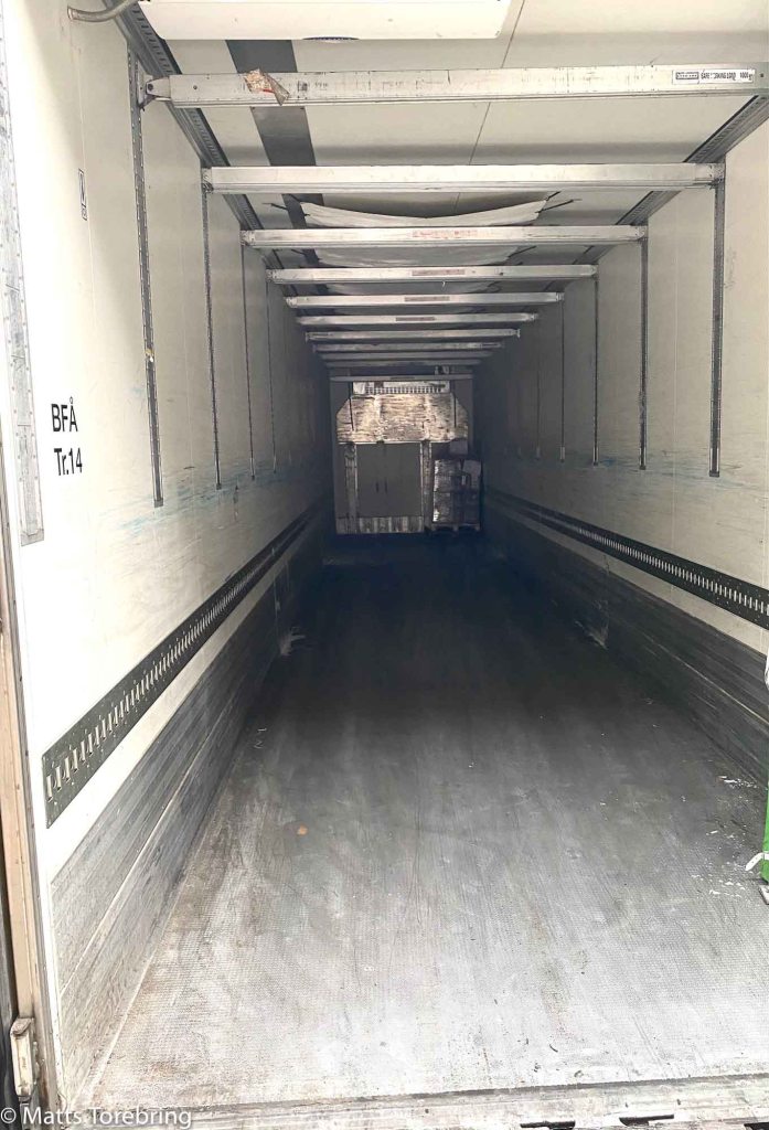 Detta har jag hört talas om i flera år, men aldrig sett med egna ögon. Man ”balkar upp pallar” på lastbilarna. Först ett lager på golvet, sedan fälls balkar ned från taket, som belastas av nya pallar. I stället för 18 pallar ryms nu 36 pallar på en enda lastbil.