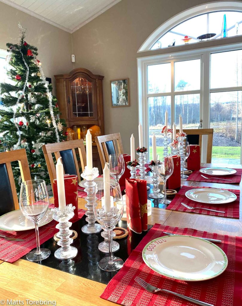 Dukat för bara fem, trots att bordet rymmer tio personer totalt. Vi skulle varit nio personer, men dottern med familj, valde klokt nog att fira jul hemma i Stockholm. Vi hade många digitala möten, som till exempel, när det tillverkades marsipantomtar i familjens kök i Stockholm.