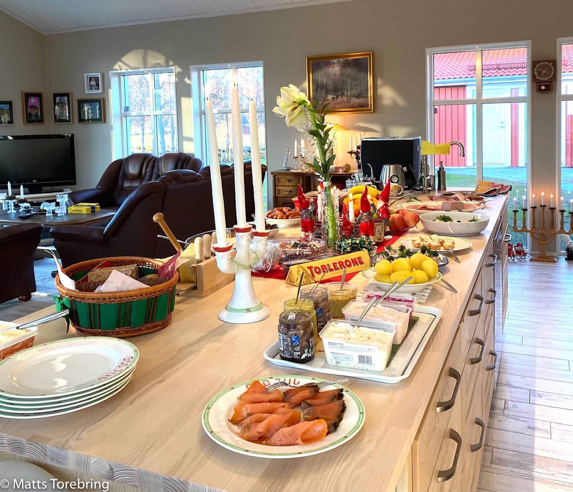Dukat för bara fem, trots att bordet rymmer tio personer totalt. Vi skulle varit nio personer, men dottern med familj, valde klokt nog att fira jul hemma i Stockholm. Vi hade många digitala möten, som till exempel, när det tillverkades marsipantomtar i familjens kök i Stockholm.
