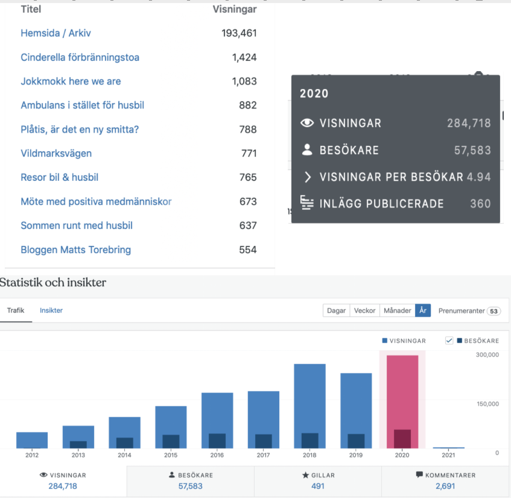 När jag vet att någon ligger före mig, men inom räckhåll, måste jag köra ifatt och köra om. Det sporrar mig till att hitta en tråd att skriva kring varje dag. Jag lyckades inte helt förra året, det blev som ni ser, bara 360 inlägg under årets 365 dagar. (Jag var ju ”borta” minst två dagar under hösten) Drygt 780 sidvisningar varje dag, året runt är jag stolt över..