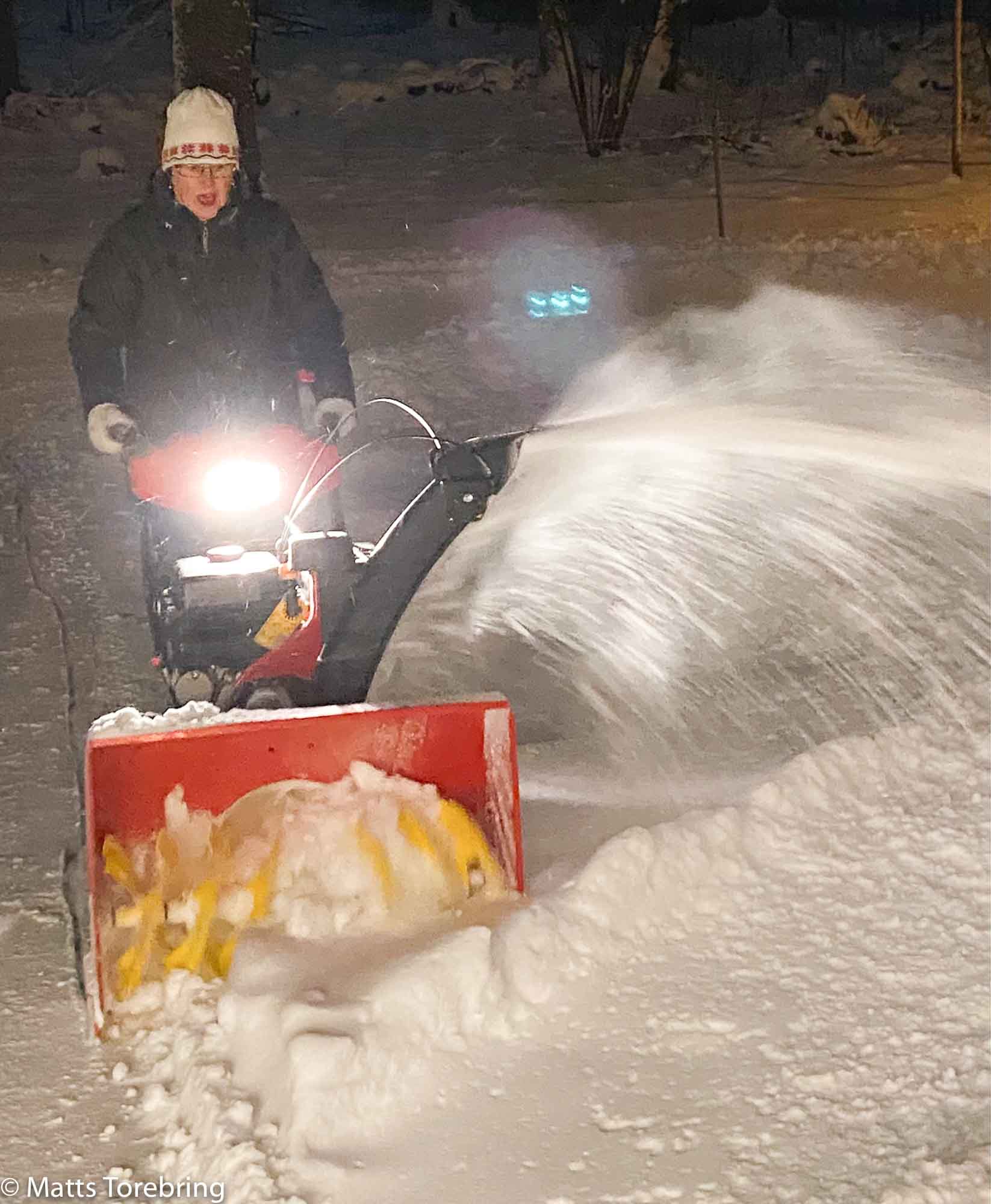 Birgitta kör snöslunga för första gången i sitt liv, efter nattens överraskande stora snöfall, 25 till 30 cm. Så smidigt med ett enda ryck i snöret så startar den. Birgitta fick dra i snöret och starta. Själv vågade jag inte anstränga mina operationssår. Jag har ”troligtvis elstart” på den, men den har jag aldrig testat. Det spelar ingen roll hur stora snövallarna är, den äter sig bara fram, utan att det hörs på motorn