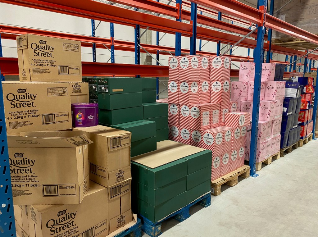 Ett 30- tal pallar på rad med Påskgodis som skall packas