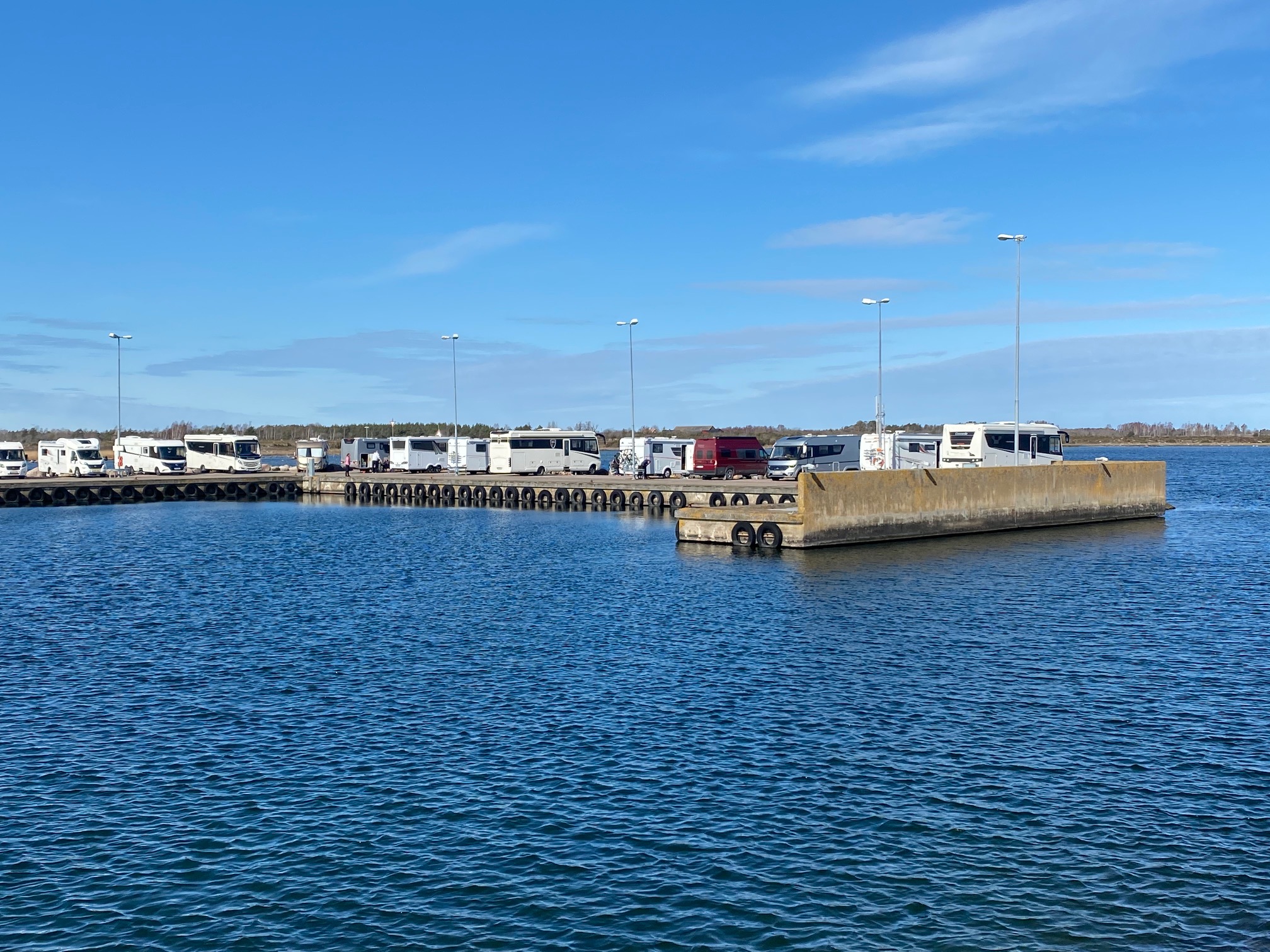 Att komma sent Skärtorsdagskväll och få bästa platsen, längst ute på piren är nästan för bra. Långfredagskväll vid 17- tiden är vi 44 riktiga husbilar och en ”plåtis” på plats.