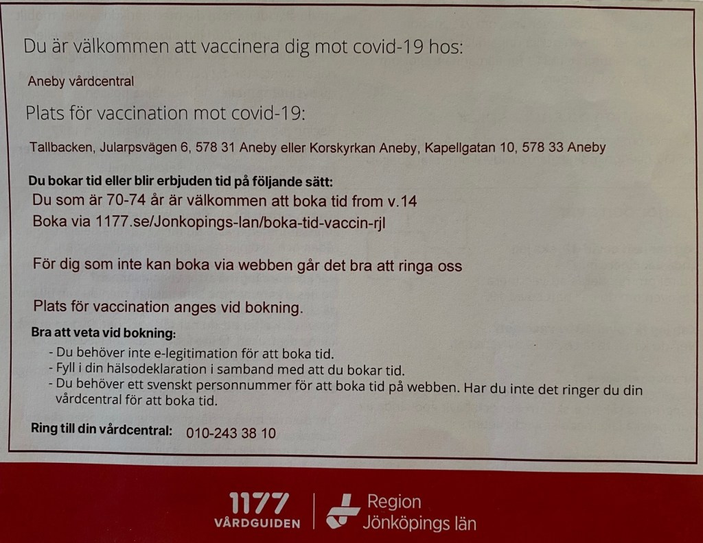 Vi får nog vänta, vi hör inte ett ljud och VC har inget med det att göra säger region Stockholm, konstigt med alla upprop som kommer från privata aktörer och pensionärer störtar dit i hundratal och köar tätt, munskydd är det si och så med och många får efter timmar i kö åka hem ovaccinerade. Alltså det är Sverige och visst i en huvudstad. Anser också att alla ska ha rätt att få veta vilket vaccin som ges. Önskar er lycka till och Birgitta ska tala om de allergiska reaktioner hon haft tidigare så kan ett visst vaccin vara lämpligare än ett annat. Allt gott till er.