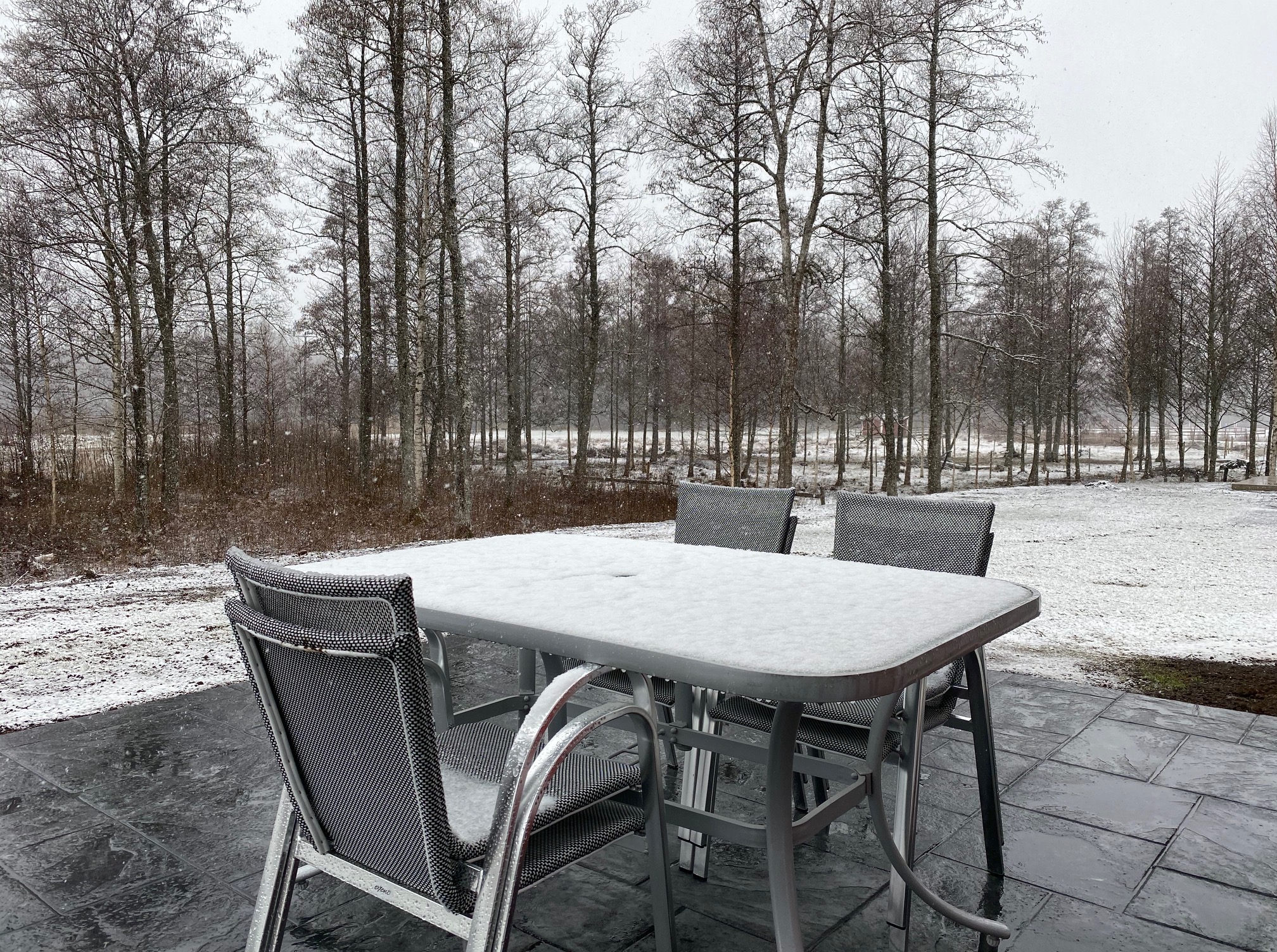 Utsikt från vårt vardagsrum. Altan utanför vardagsrummet. Bara att konstatera, våren blir bara kortare och kortare för varje dag.