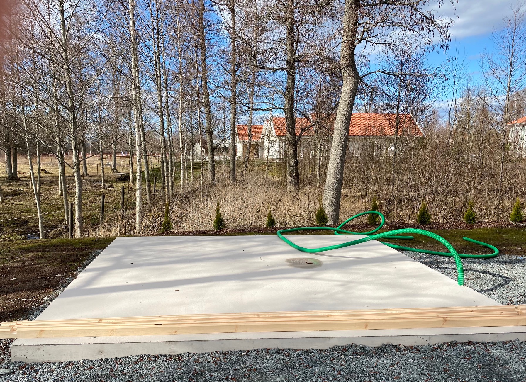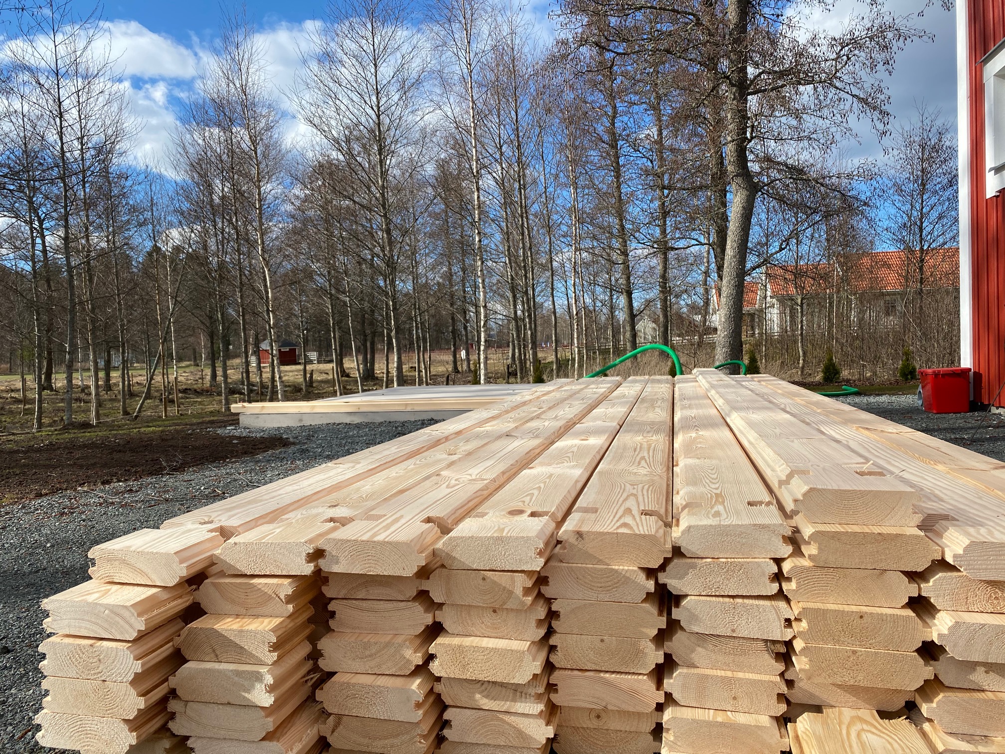 Vilken service från Eka Skog, avlastat ända inne på byggplatsen. Mina snickare har ”lovat” att komma på måndag. Vad skönt att bli av med all ved på jobbet under ett skärmtak, snöslunga, skottkärra mm, som trängs med mig inne i garaget.