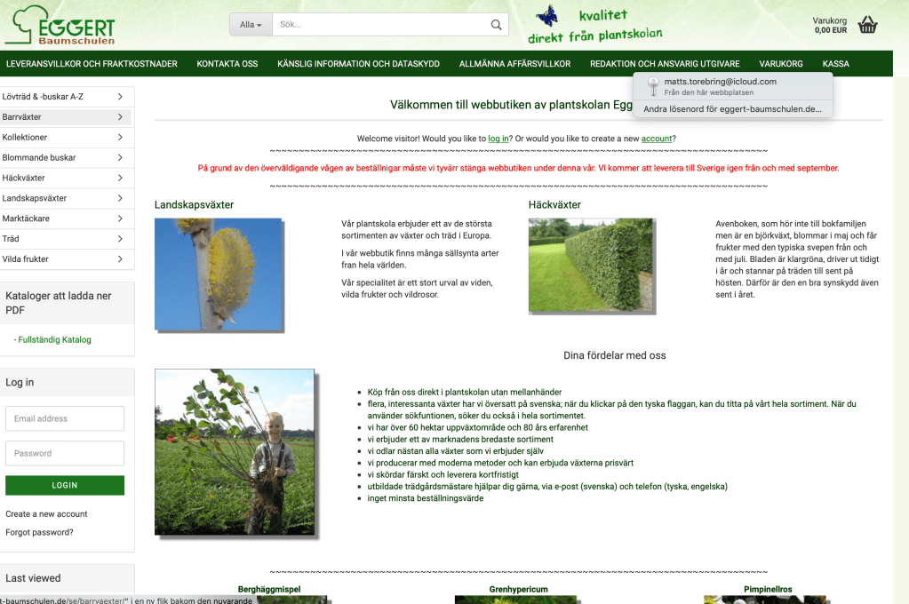 Eggerts Plantskola i Tyskland har haft fantastiskt fina leveranser till oss. Nu är deras webbshop delvis nedstängd (se den röda texten) på grund av stor efterfrågan. Jag har letat runt på massor av ställen i Europa men utan resultat. Nu svarade Eggerts i afton, att de skulle kunna skicka till mig trots allt. Hos Eggerts kostar en Taxus Baccata Repandens 16,90 €. Hos Plantagen helt orimliga 699kr. Jag skall plantera 36 styck.
