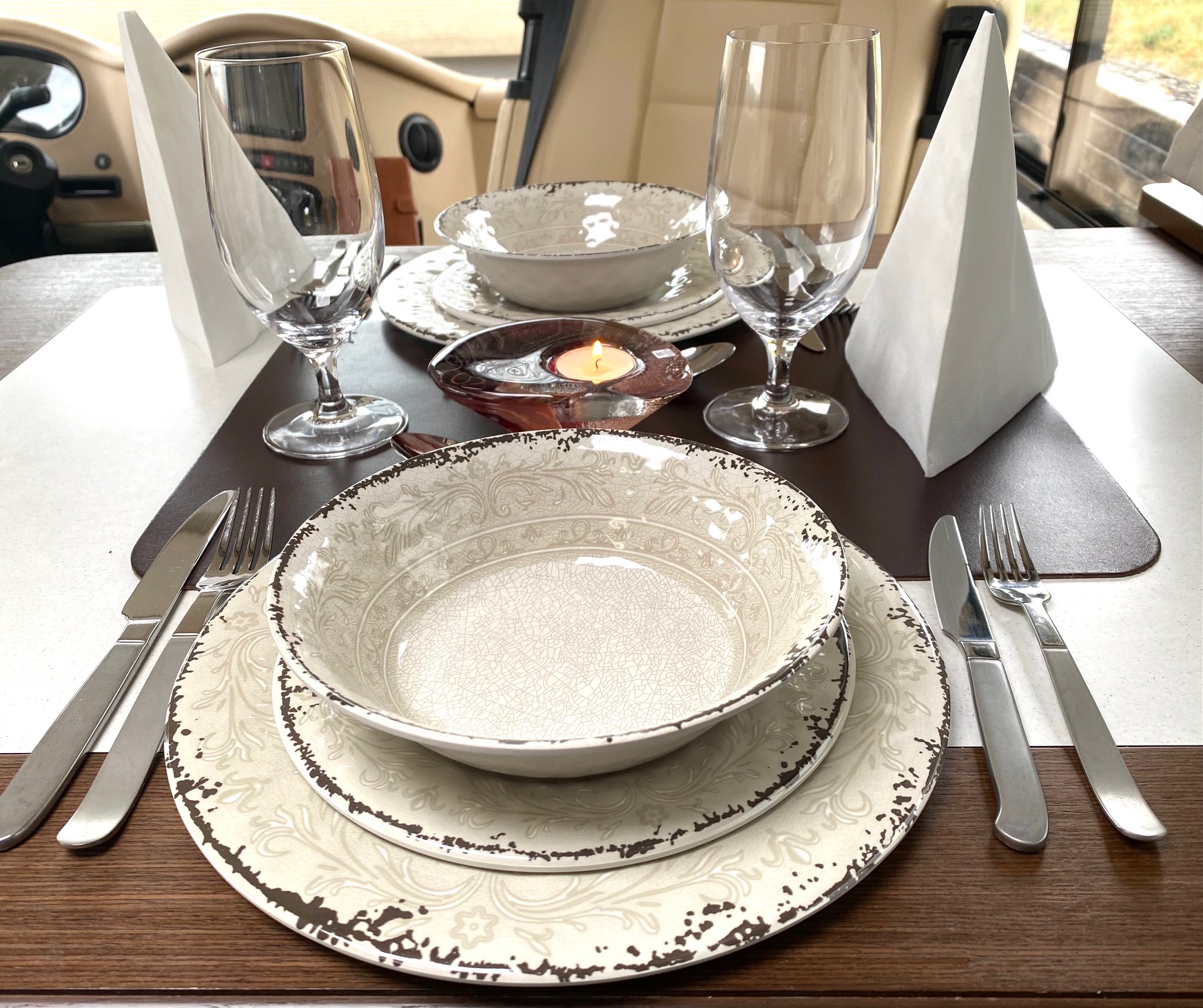 Riktiga bestick och glas har vi haft den största delen av vårt husbilsliv. Tallrikar och skålar har vi nog alltid haft melanin, beroende på tyngden i skåpen. Vi har sista åren tyckt att mycket har varit ganska snygga serviser, men inte riktigt bra ändå. Nu hade Forsbergs fått in en ny service som kändes klockren. Den passar till träet i bordet.