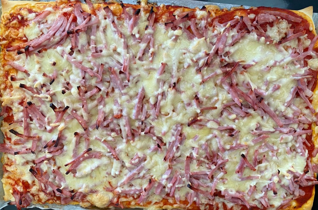 När jag var klar efter ett par timmar, bjöd Birgitta på en härlig egenhändigt producerad familjepizza på plåt i ugnen.