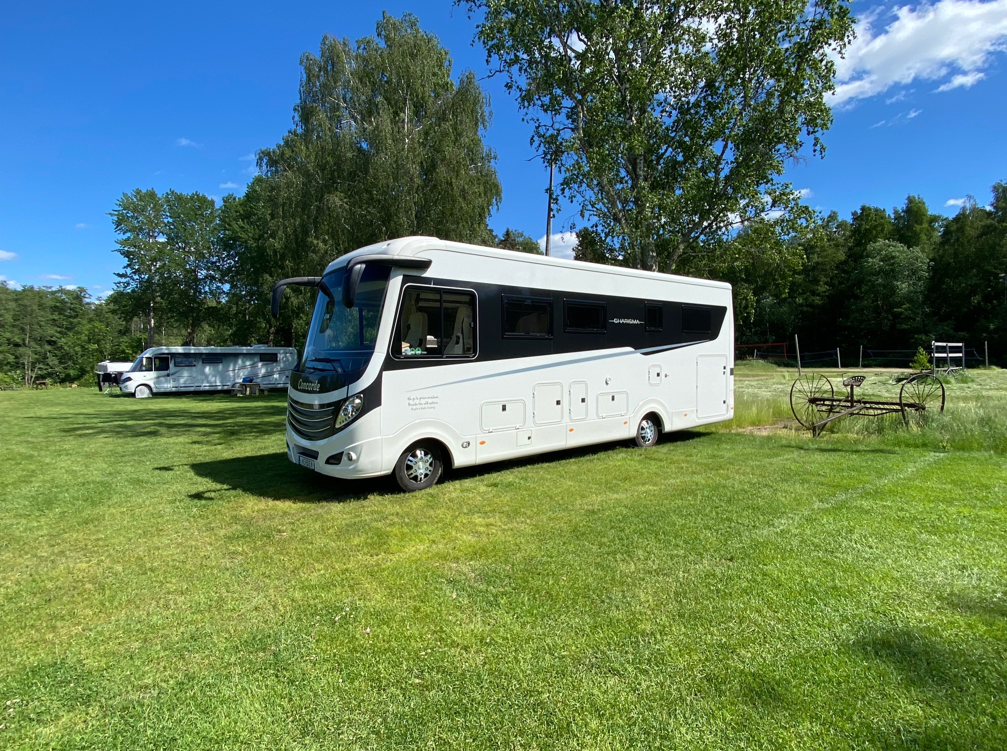 Enormt stora ställplatser på riktigt grönbete. Jag har inget drag på bussen för att sätta för hästräfsan. Jag förstår att Irene & Lennart, med bloggen Lennarts Tankar, vill bo här nästan hela året. Nu fick vi även tillfälle att gratulera Irene på sin högtidsdag.