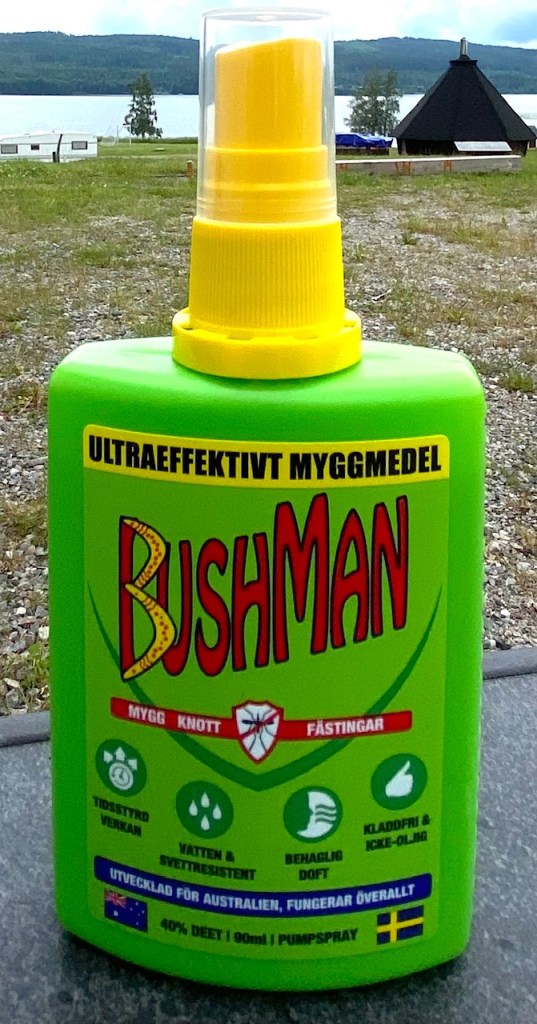Vi gick en runda i går kväll nere vid sjön. Vi fick fullt av knott och mygg på oss och stora svullnader efter deras stick. Vår trevlige campingvärd gav oss rådet att köpa detta, det finns i byn nere, sa han. Det har utvecklats för Australien. Använder du detta försvinner mygg & knott. Vi cyklade dit och inhandlade detta. Det var inte billigt, men hjälper det bara är lyckan vår.