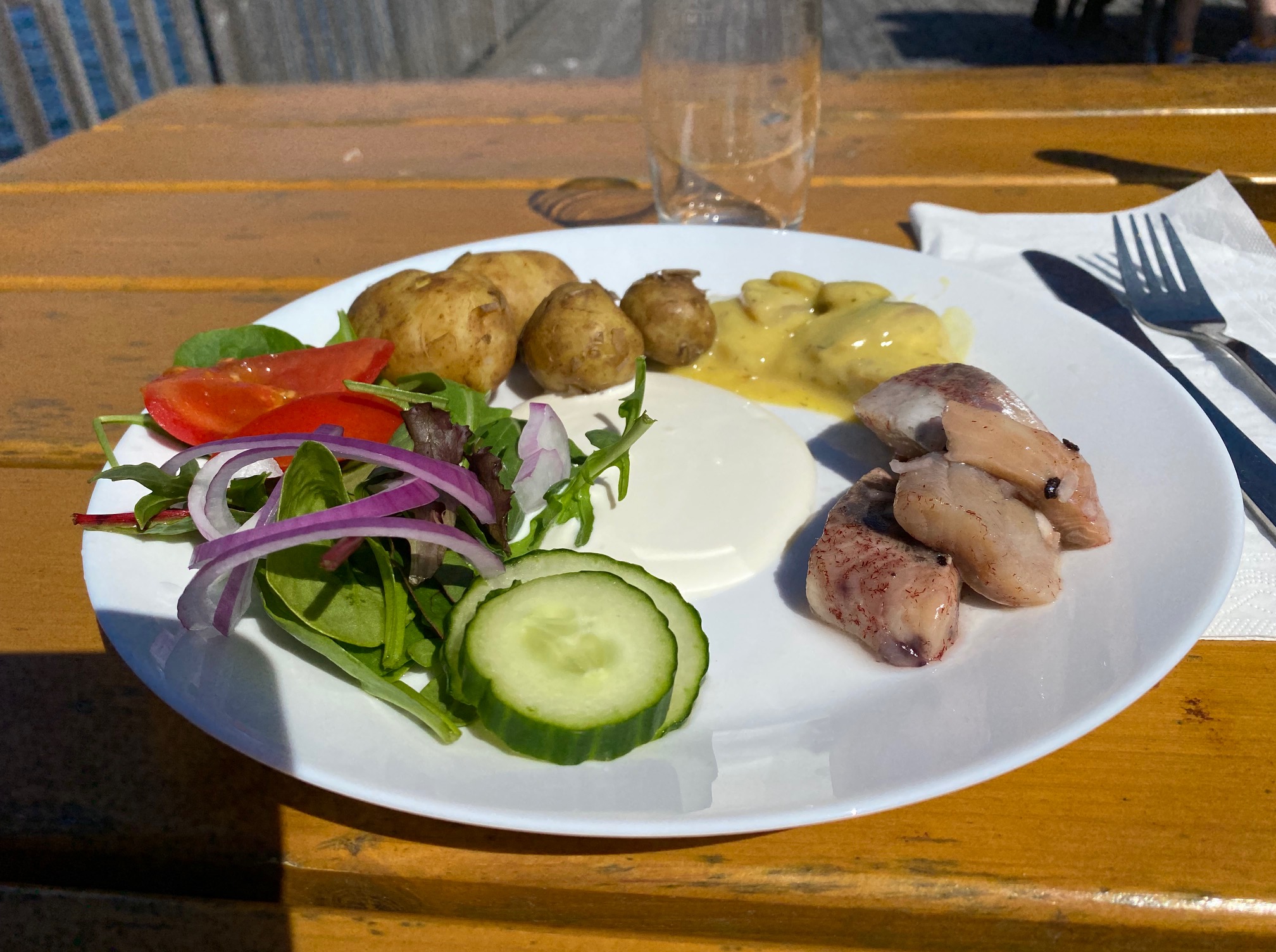 En ganska billig lätt lunch med kalla potatisar, gräddfil och sill. Ibland bryr man sig inte om att säga till, vi vill ha varma potatisar. Det var inte så mycket maten vi ville njuta av, det var utsikten.