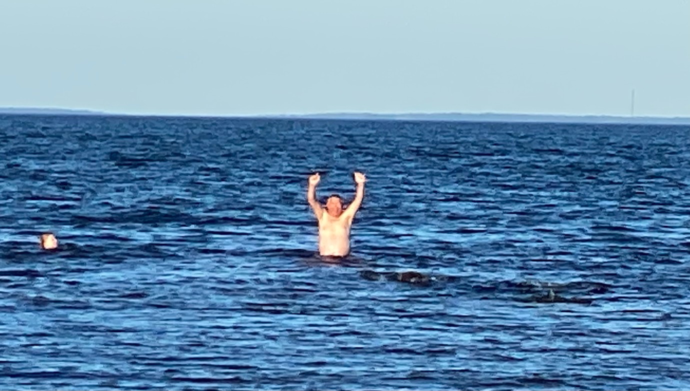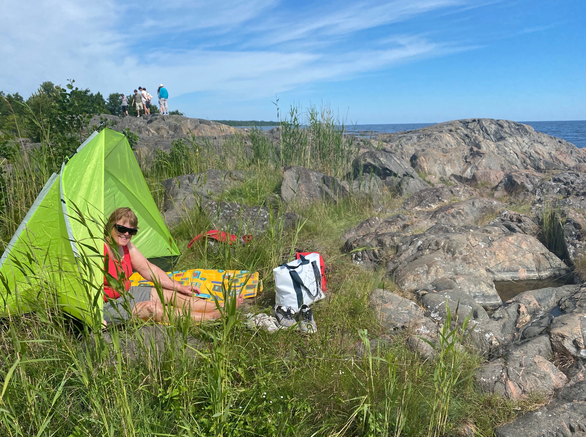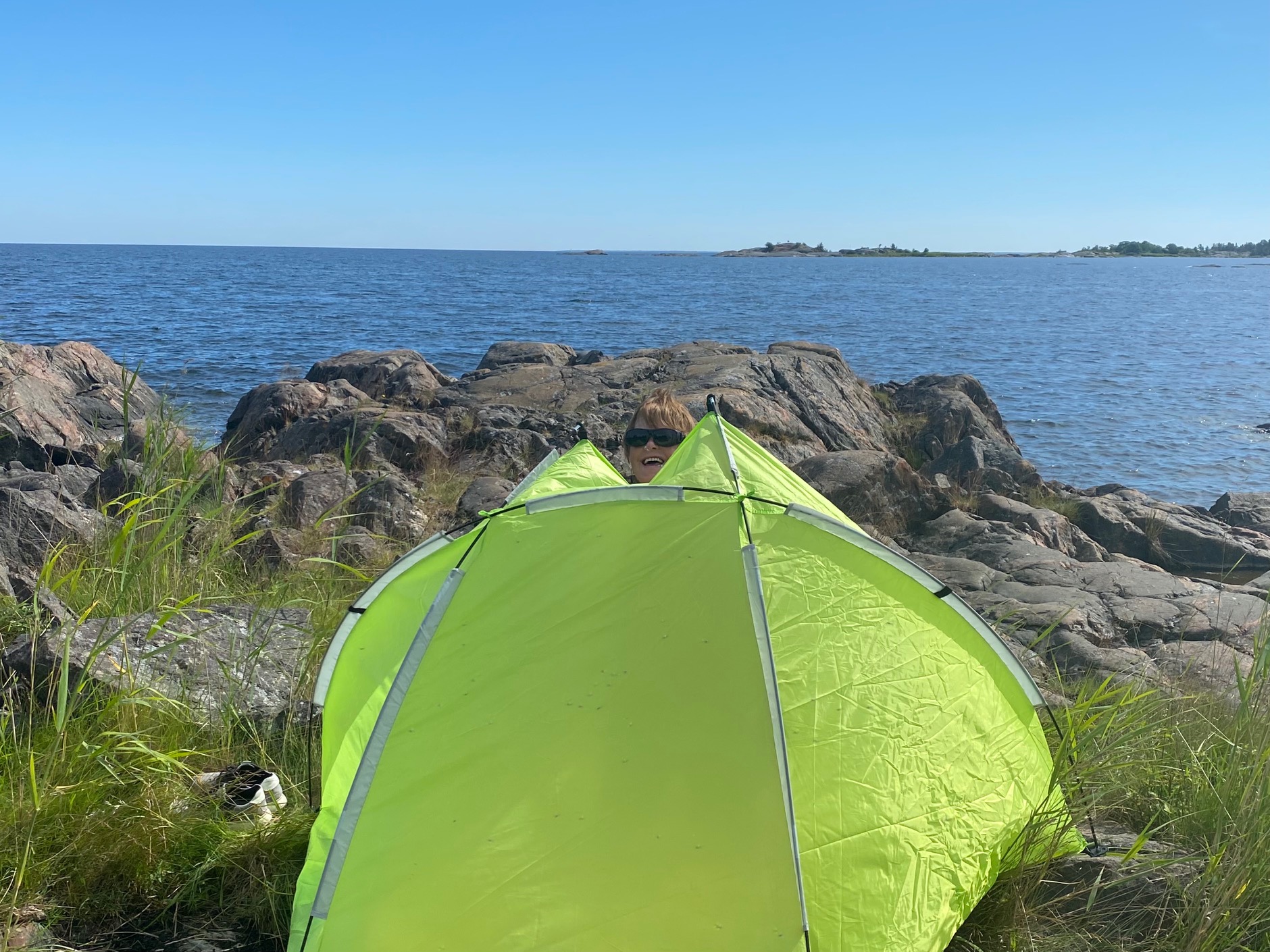 Vi gick ned till havet idag, men först gick jag till receptionen och ökade på en dag, till totalt tre dagar som vi stannar här på Ängskär Havsbad. Samtidigt köpte jag nybakade frallor, till förmiddagsfikat på stranden. Birgitta sticker upp i öppningen till vindskyddet.