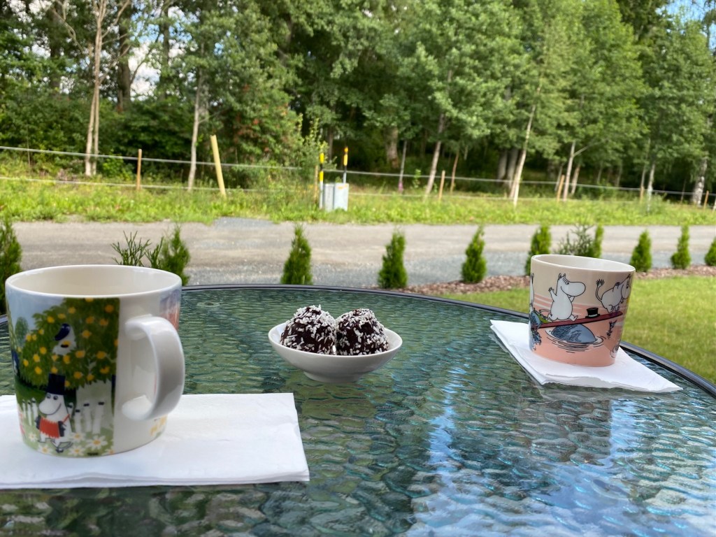 Det blev till slut för varmt på västersidan, så vi fick gå till öster för att inta kaffe på maten i skuggan på sovrumsaltan. I morgon skall vi fara till handelsmannen Inge Bengtsson i Korsberga, Vetlanda. Det blir nog en kaffekorg med på resan, samt kanske lite golf i Korsberga. Kanske han har en båt som vi gillar.