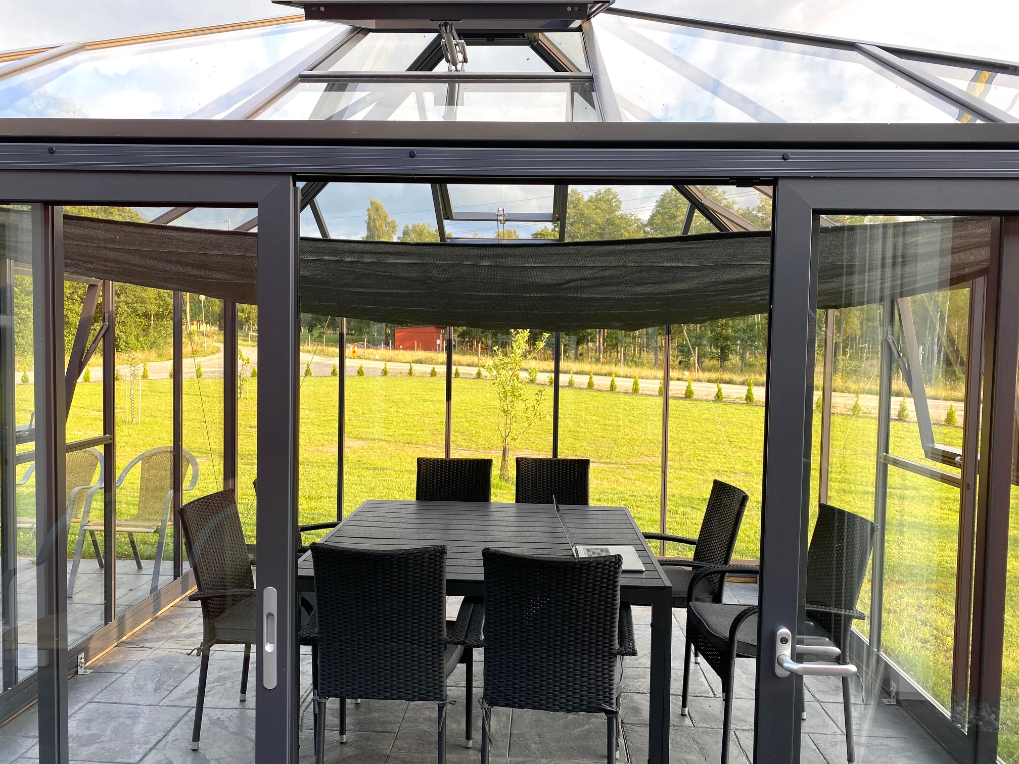 Det förstår jag att ni behöver, blir ju som bastu i ett glashus. Vi har både tyg i taket och jalusigardiner på ett par av sidor.