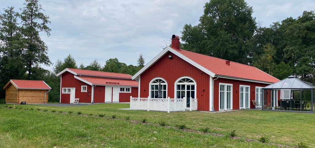 Vår gräsmatta har inte blivit gul än, men den är inte bra heller. Så skönt att alla 160 buskarna och fyra fruktträd, som jag planterat, har klarat sig denna torra sommar. Jag vattnade till en del, innan vi for på vår semester. Ikväll hann jag olja in sista gaveln på boden, efter att jag hämtat mera färg. När jag kom till Huskvarna i eftermiddag, var det hela + 31 grader. Jag som trodde att Vättern skulle ge svalka.