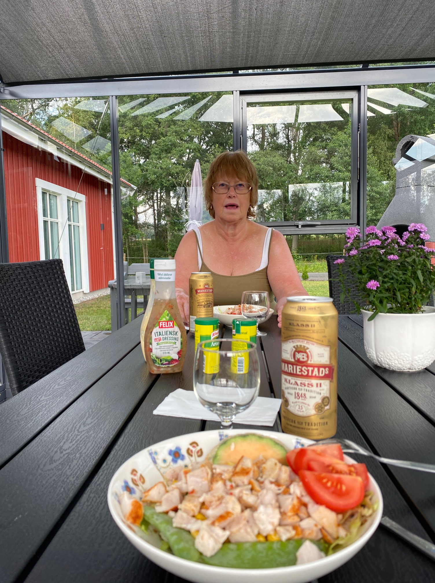 Idag går det mot 30 igen men en skön vind och tack och lov lite moln. Ja bara att känna lite vind är skönt. Bestämde mig för att börja lite lätt träning i hemmagym och bättre med fem minuter än inget är en sanning. Och sallader ska vi köra mest med, jag äter för lite i hettan men bra att ha en plan och följa den. Vi gjorde med kyckling också och mycket grönt. Får se om vi hittar variationer men så många behövs inte. Du kan berätta vad ni hittar på.